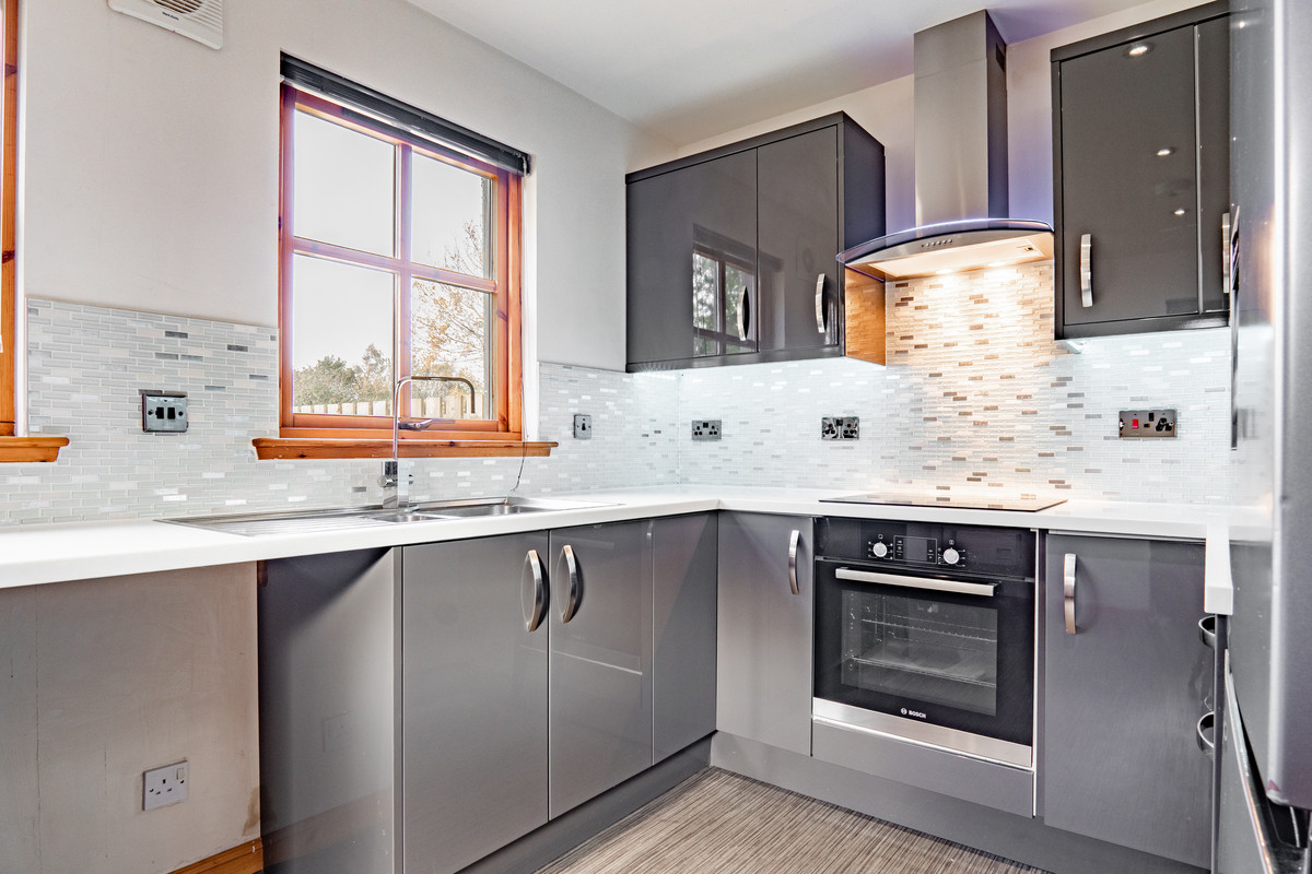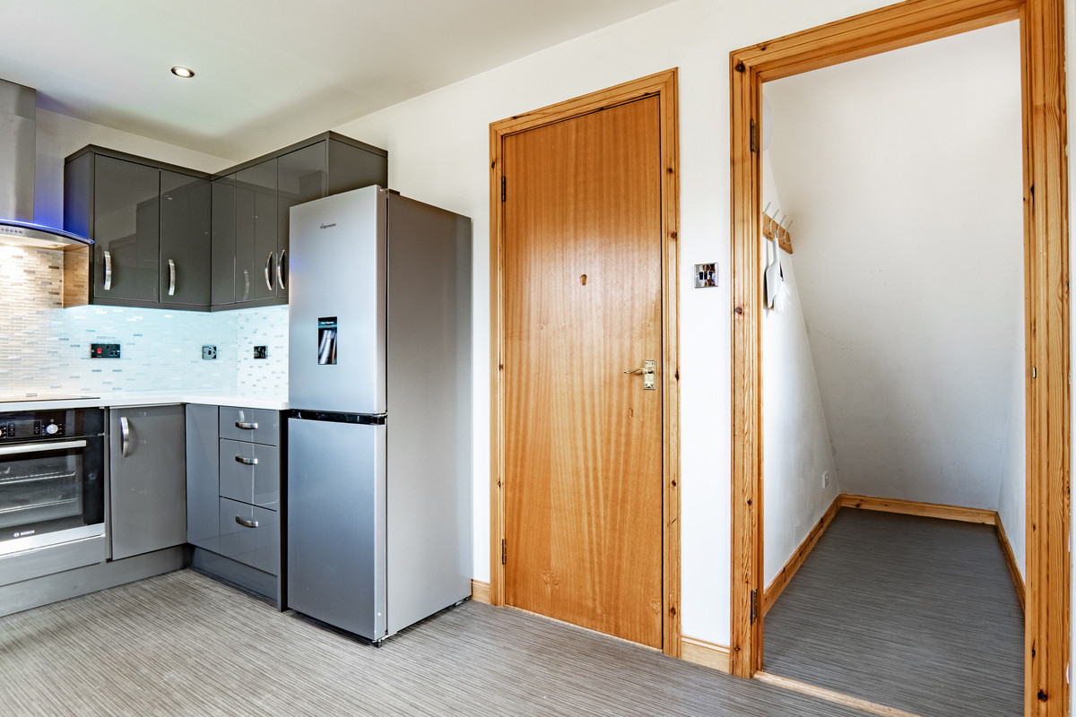 A doorway from the sitting room leads into the kitchen, a beautifully refitted and contemporary space. The units are finished in a sleek dark grey gloss, complemented by light laminate worktops and a mosaic style tiled splashback that adds a touch of texture and colour. Under cabinet and feature lighting enhance the modern feel, reflecting off the smooth surfaces and brightening the entire room. Integrated appliances include an oven, hob and matching extractor hood, while space is provided for a freestanding fridge freezer and washing machine. The window above the sink allows natural light to flow through, framing a pleasant outlook over the rear garden. Durable flooring runs underfoot, tying the whole design together and ensuring easy maintenance. Tucked neatly off the kitchen is a small cubby style recess, ideal for storing household items or larger kitchen equipment, keeping the main space uncluttered and organised.