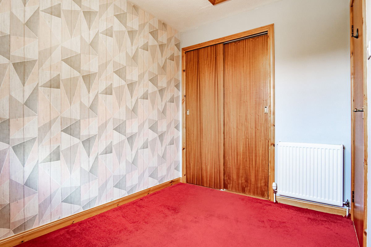The second bedroom overlooks the rear of the property and is enhanced by its colour palette. The space features a bold patterned accent wall of soft pinks and greys that adds character, balanced by neutral tones on the remaining walls. Practical built-in wardrobes with wooden sliding doors provide useful storage. Finished with a warm carpet and timber skirtings, it’s a versatile room well suited to use as a bedroom, study or hobby space.
