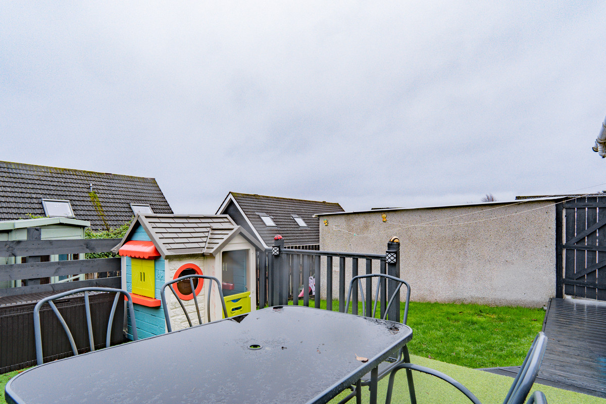 Outside, the bungalow has garden space to the front, side and rear. The front has a lawn bordered by planting and a tarmac driveway that leads to a semi-detached garage, built in concrete block with a metal up and over door. A gate beside the garage links through to the back garden, where the space is divided between lawn and raised decking. The decking forms a neat platform beside the French windows, giving room for outdoor seating, while further raised sections sit to the side with painted fencing providing privacy. A small timber summerhouse stands on a paved corner at the back with the remaining boundaries formed with a mix of timber fencing and screening.