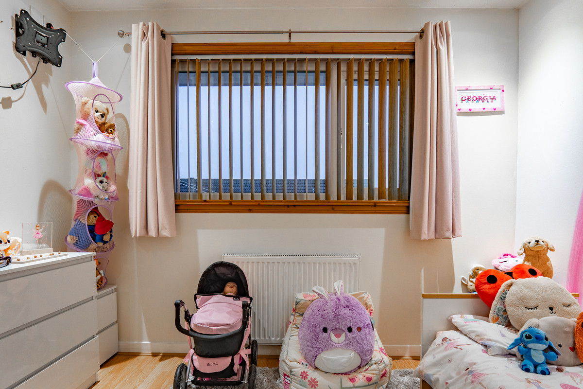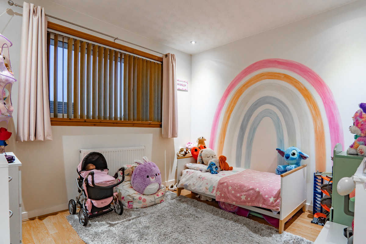 Bedroom 3 has a more playful character, with plenty of space for furniture, shelving and a small desk. The window sits higher here, which helps keep the lower walls free and opens up the layout for different uses. The cupboard provides storage, and the neutral walls make it easy to imagine the room set up to suit a child, teen or as a compact office.