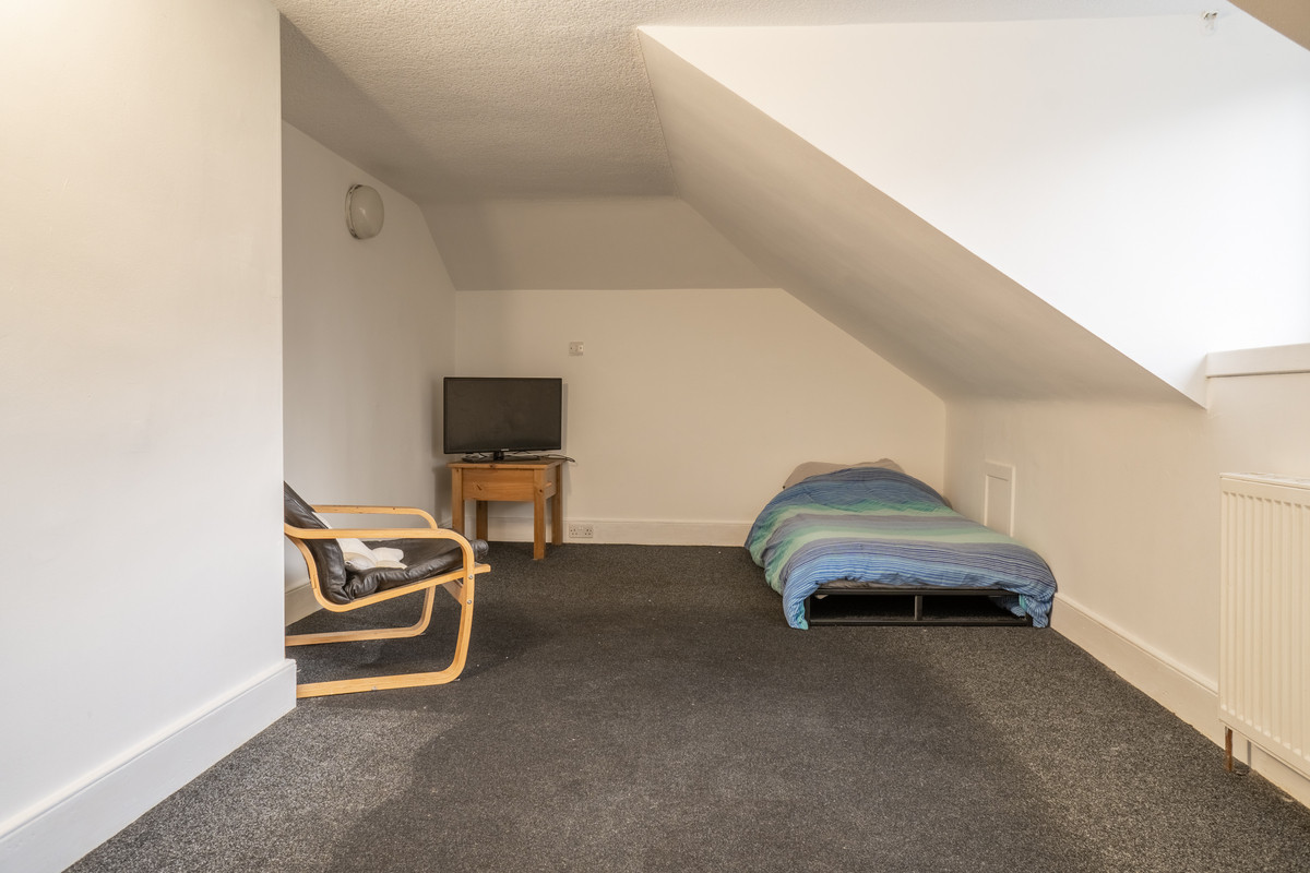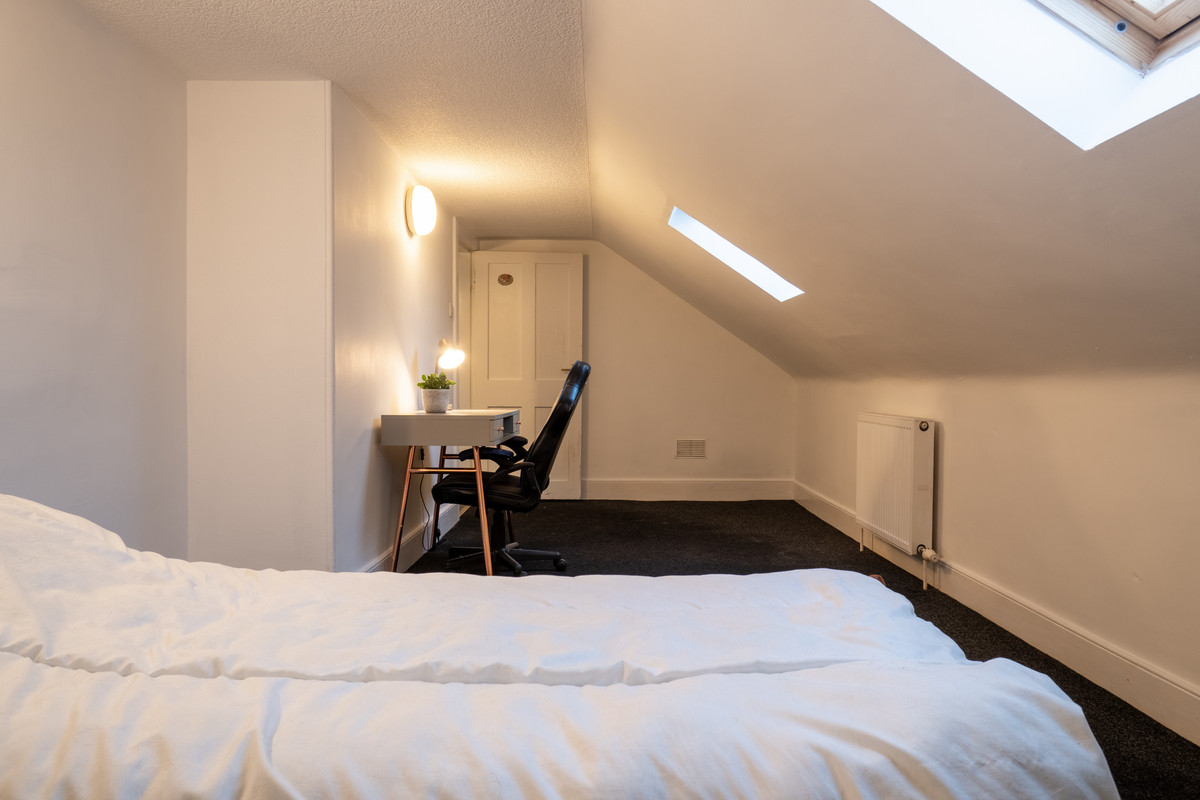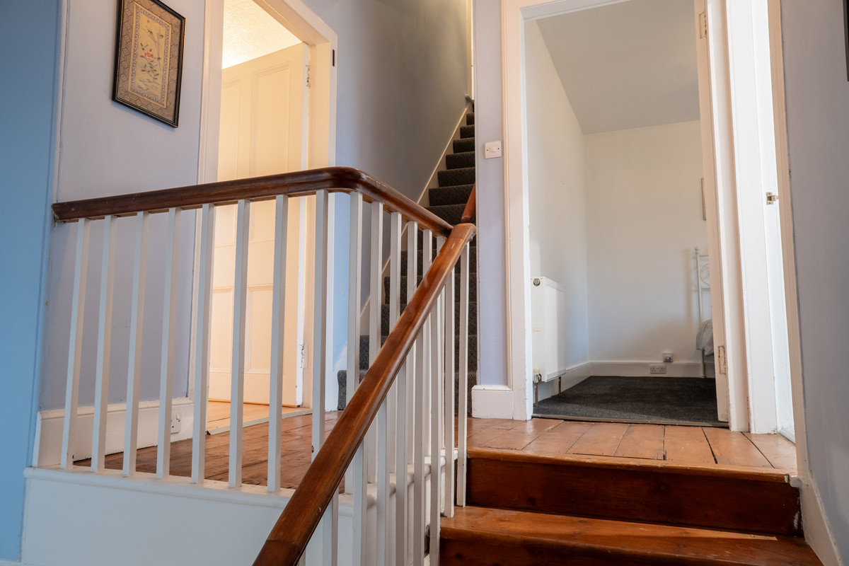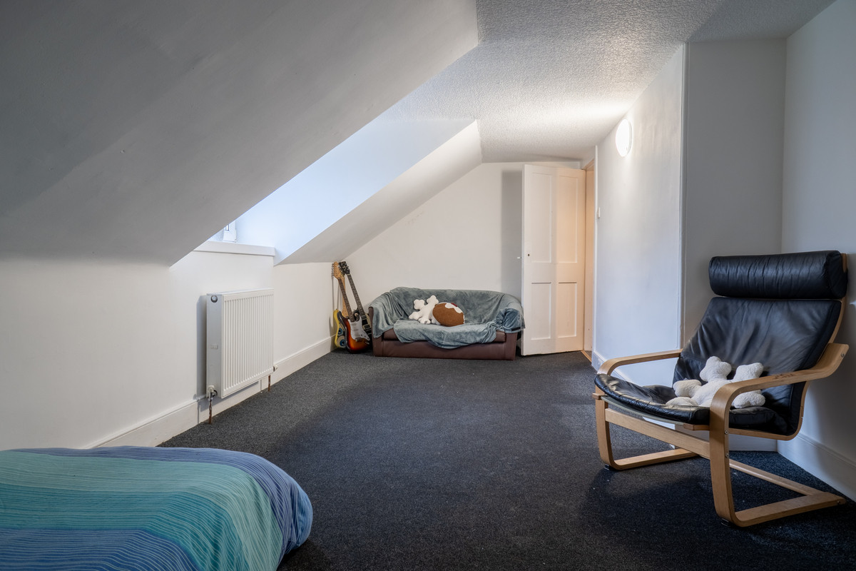 Up another staircase to the attic floor, you’ll discover two additional bedrooms. Bedroom three, with its sloping ceilings, is perfect as a single bedroom or home office. The larger fourth bedroom offers ample space for a double bed and furniture, complemented by a small window that brings in natural light.