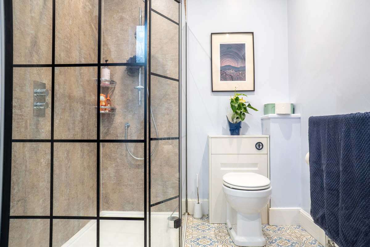 The sweeping staircase leads to the first floor, where you’ll find the serene master bedroom, a bright space with neutral décor and a well-appointed en-suite shower room. The en-suite features standout patterned floor tiles, a modern shower cubicle with black-framed doors and earthy wet-wall panelling. A second bedroom on this level, decorated in crisp white, offers a versatile and peaceful retreat.