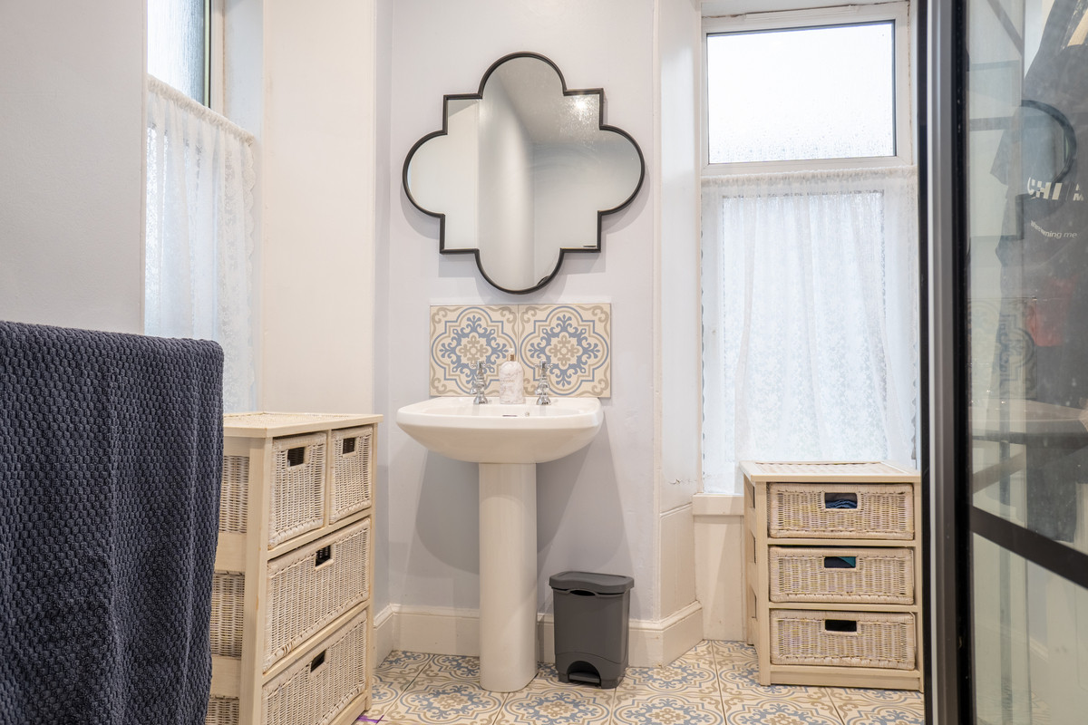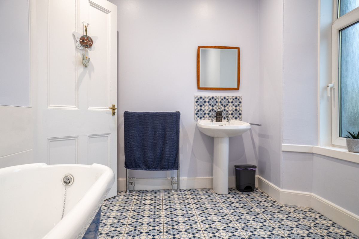 The family bathroom is a standout feature, showcasing a classic roll-top bath with a bold blue exterior, patterned tiles, and traditional details that exude timeless elegance. Its thoughtful design balances vintage character with modern convenience.