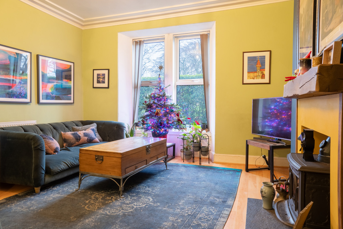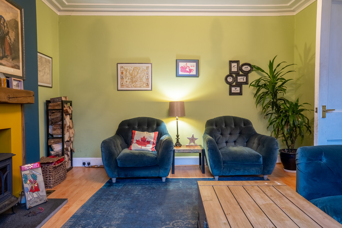 The living room is an inviting space, boasting a bay window that floods the room with light. A standout multifuel stove sits proudly within a feature dark blue wall, adding both charm and practicality, while the striking green on the other three walls contrast beautifully to create a cosy yet vibrant atmosphere.