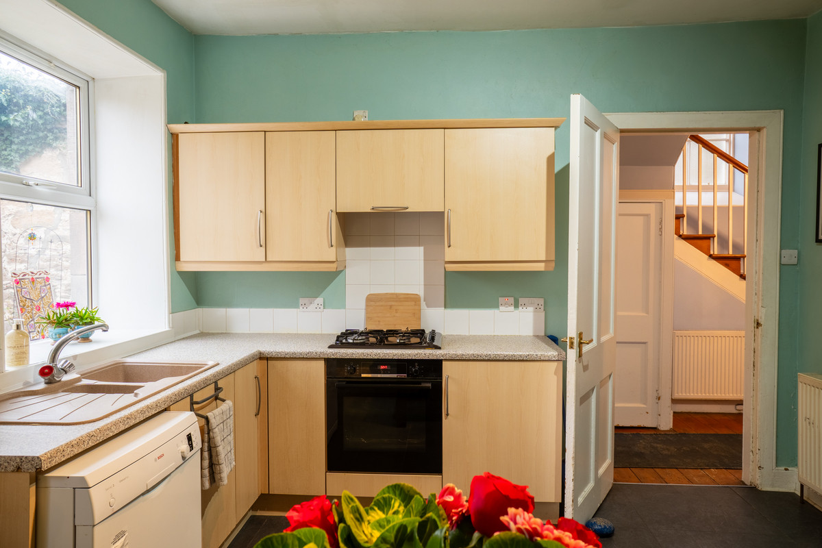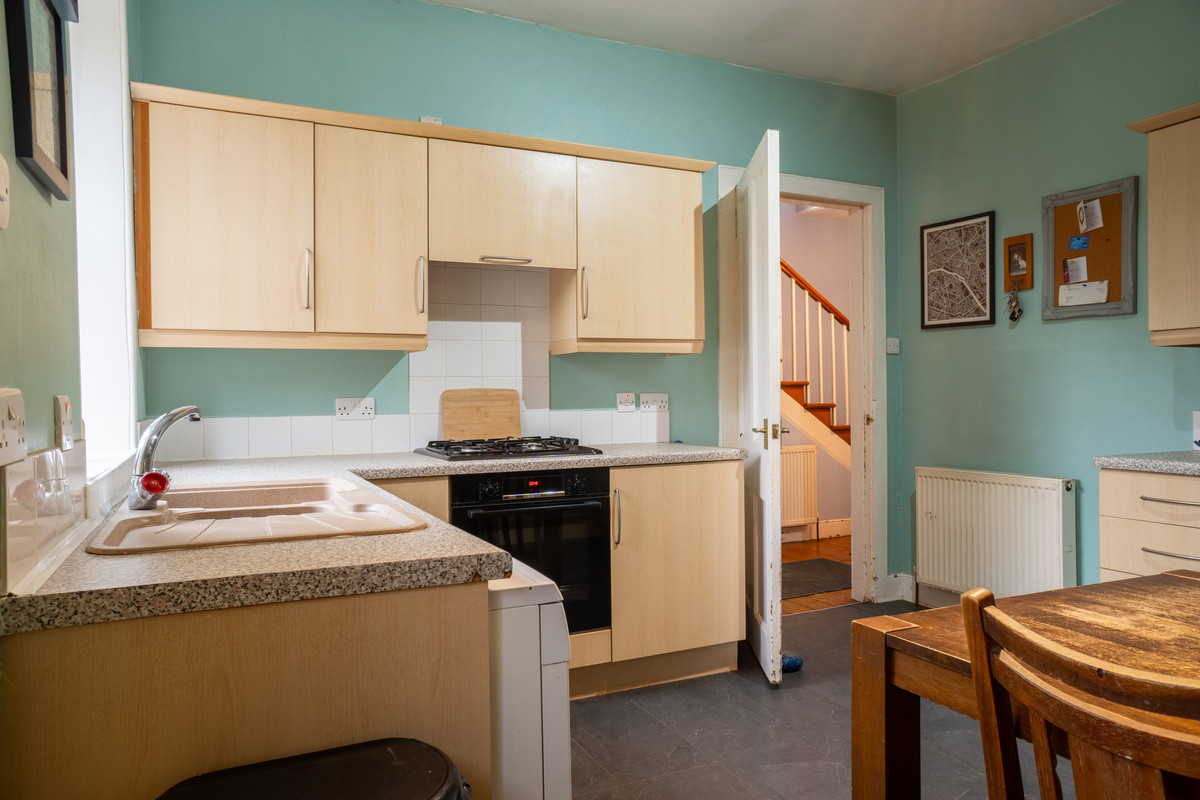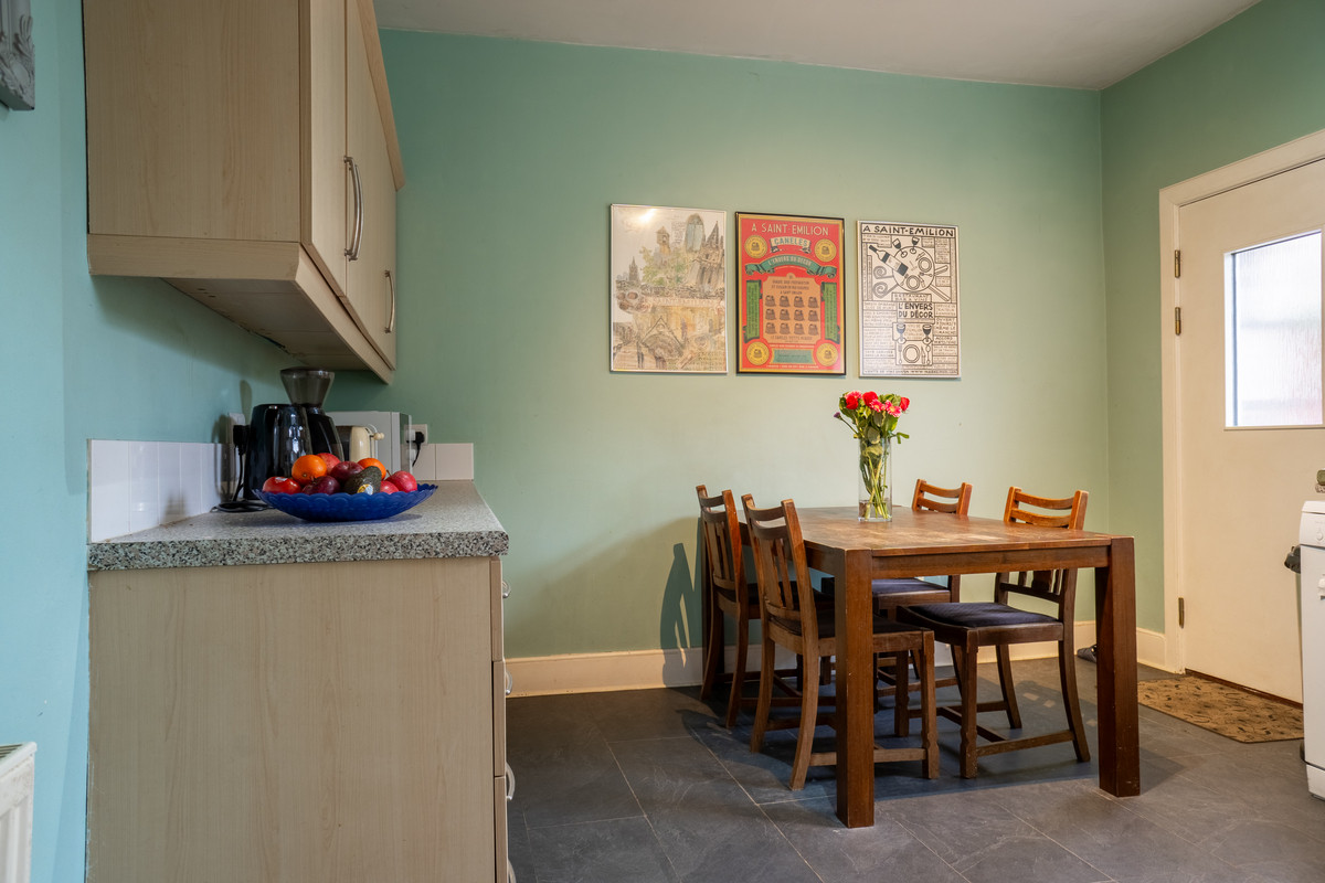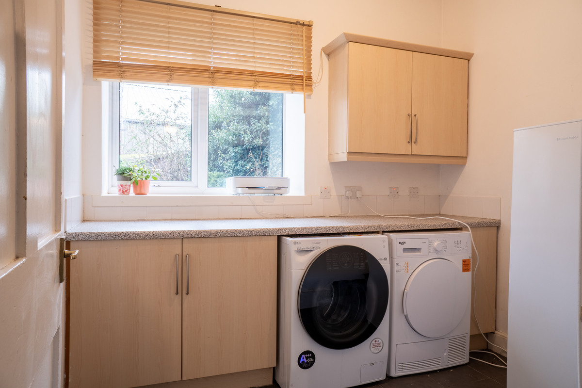 Along the hallway you’ll find the traditional kitchen, with light wood-style cabinets accented by chrome handles. The design maximizes storage and functionality, with worktops lining three walls and handy space for a dishwasher. There’s even room for a dining table and chairs, making this an ideal spot for family meals. A back door opens to the rear garden, connecting the indoor and outdoor spaces seamlessly. Adjacent to the kitchen, the utility room adds further practicality, providing extra storage options and laundry facilities with plumbing for a washing machine and tumble dryer to keep family washing separate.