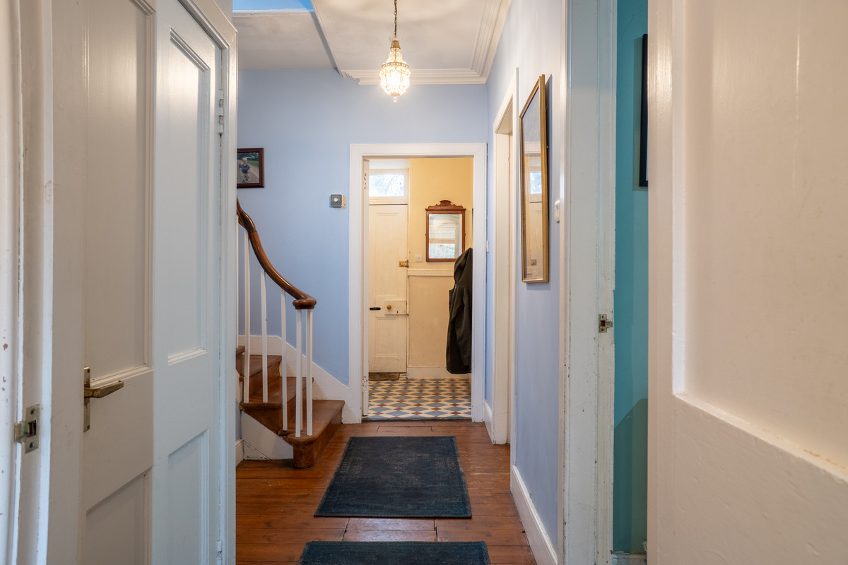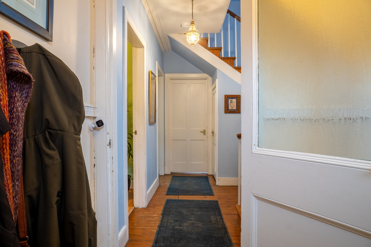 The house greets you with a striking blue front door, which sets the tone for the character and warmth within. Stepping into the hallway, the soft blue walls and elegant wood flooring create a welcoming ambiance, complemented by white doors and frames that highlight the traditional features of the home.