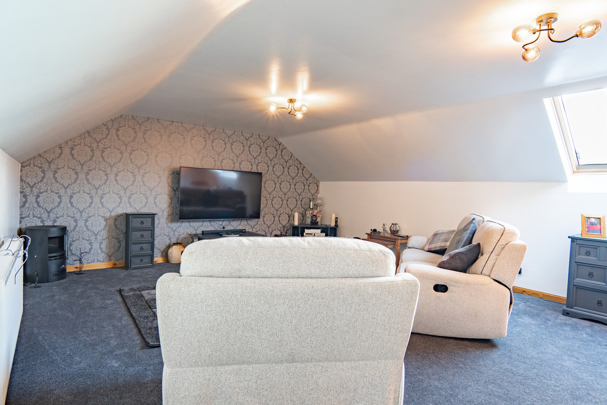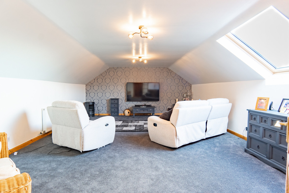 From the utility, a carpeted staircase with natural timber balustrades rises to the first floor. At the top, a bright and open landing connects two additional rooms and includes a handy hatch for further storage. One side leads into a generous sitting room, where attic style sloped ceilings and a Velux window creates a characterful yet inviting space. The room is carpeted in grey and feels expansive, offering plenty of flexibility for larger furniture layouts. A feature wallpapered gable wall adds a touch of texture and style. Fitted with a radiator and sockets, it’s ideal as a TV lounge or family snug.