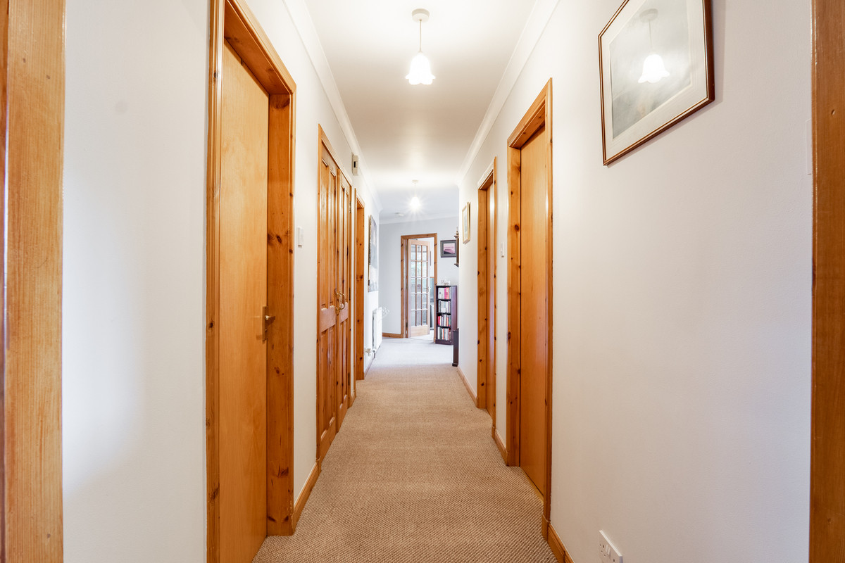 A gravelled driveway curves up to the house, where a sheltered front door opens into a wide entrance hallway. This bright, carpeted space benefits from a storage cupboard to one side while a radiator provides warmth and a sense of welcome.