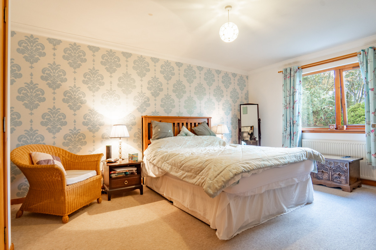The first of the three ground floor bedrooms is a generous double, decorated in soft creams with a feature wall finished with soft blue patterns, adding a touch of traditional charm without overpowering the space. The room is carpeted in warm beige and enjoys plenty of natural light through a large window. There’s a built-in double wardrobe with wood panelled doors and the room comfortably accommodates freestanding furniture alongside the main bed, creating a balanced and inviting space.