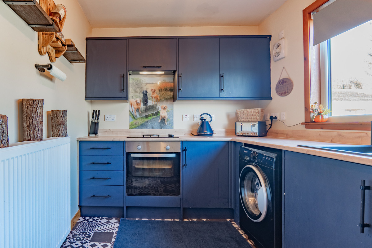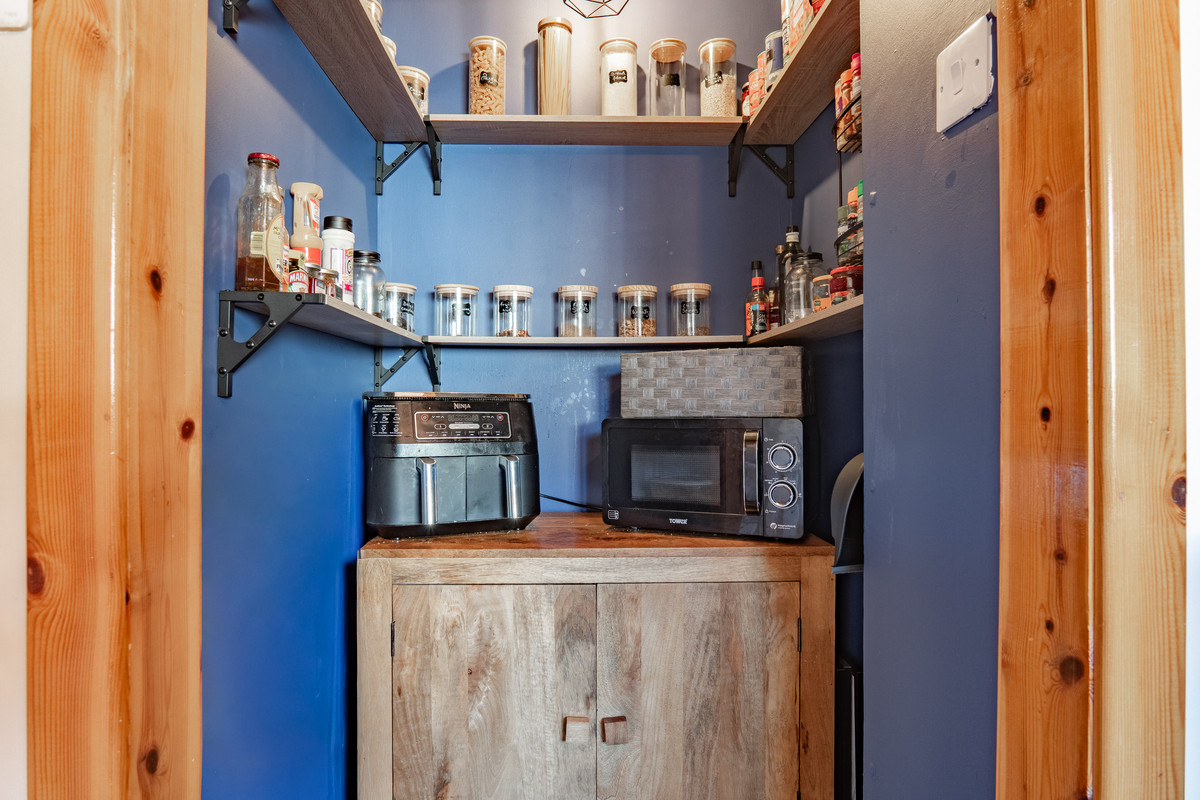 There’s a real warmth to the kitchen in the home, not just from the colours, but from how it’s been configured. The navy cupboards pop against the wooden worktops, the window keeps it bright all day, and the whole space feels ready for cooking. A pantry off to the side adds that extra touch everyone secretly wants, shelves full of jars, tins and everything in its place.