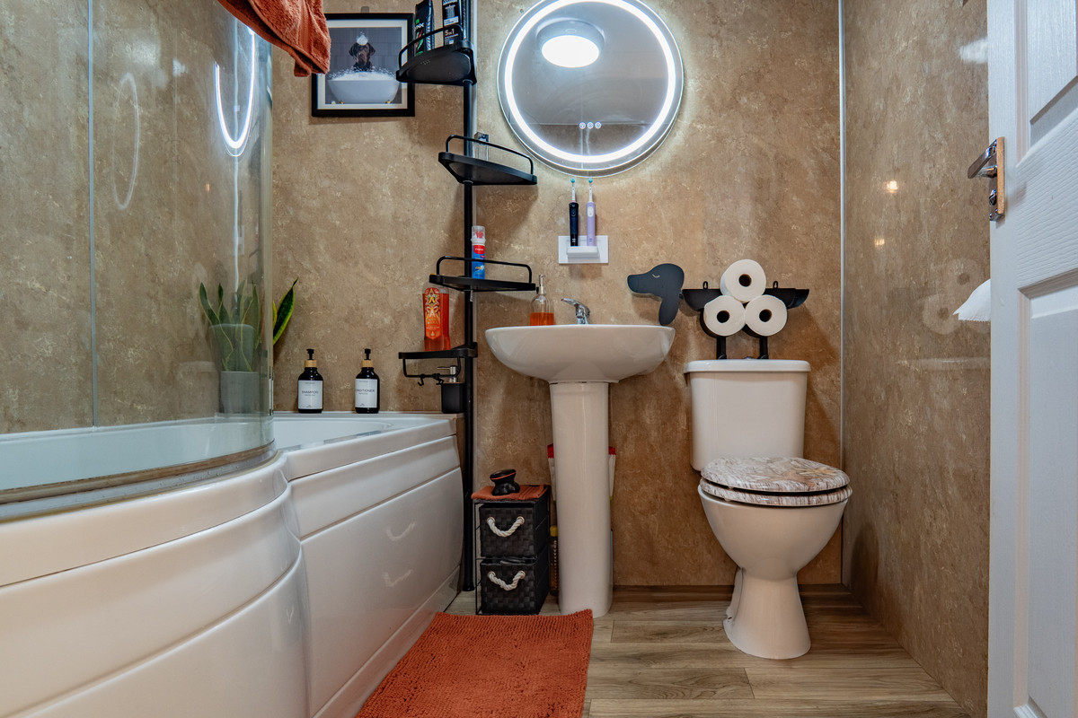 The bathroom has a clean, modern feel with warm wetwall panelling that keeps it bright and easy to look after. There’s a full size bath for when you want to relax, plus an electric shower above it for quick rinses. A pedestal sink and toilet keep the layout simple and practical, while small touches like the circular back lit mirror and neatly fitted shelving, make the space feel well thought out and comfortable.