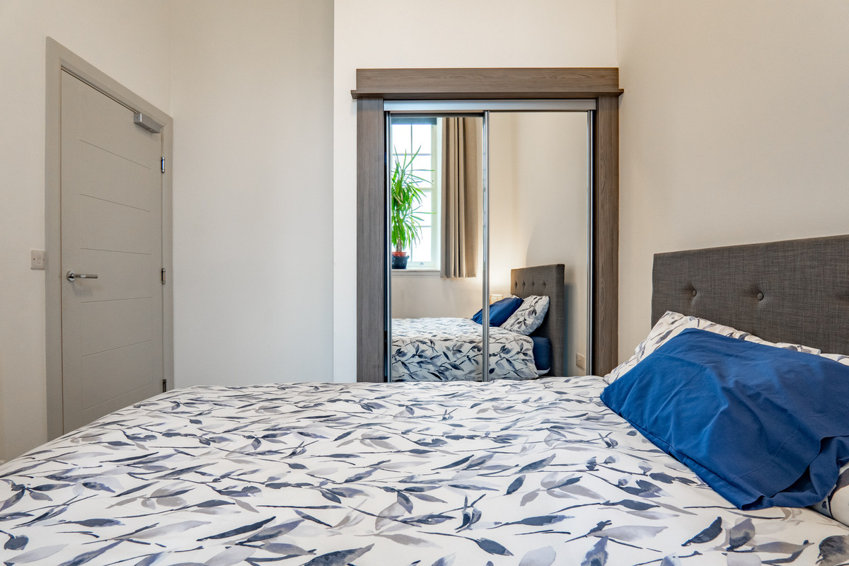 Bedroom one provides space for a double bed, and the window sits to one side, keeping the room straightforward to furnish. Between the sleeping area and the en-suite is a run of mirror fronted wardrobes, giving you plenty of practical storage without taking up the main floor space. The en-suite itself is smartly finished, fitted with a toilet, a wash basin set into a modern cabinet and a separate shower enclosure with a rainfall head and handheld attachment. It’s a smartly designed setup that keeps everything you need close at hand.