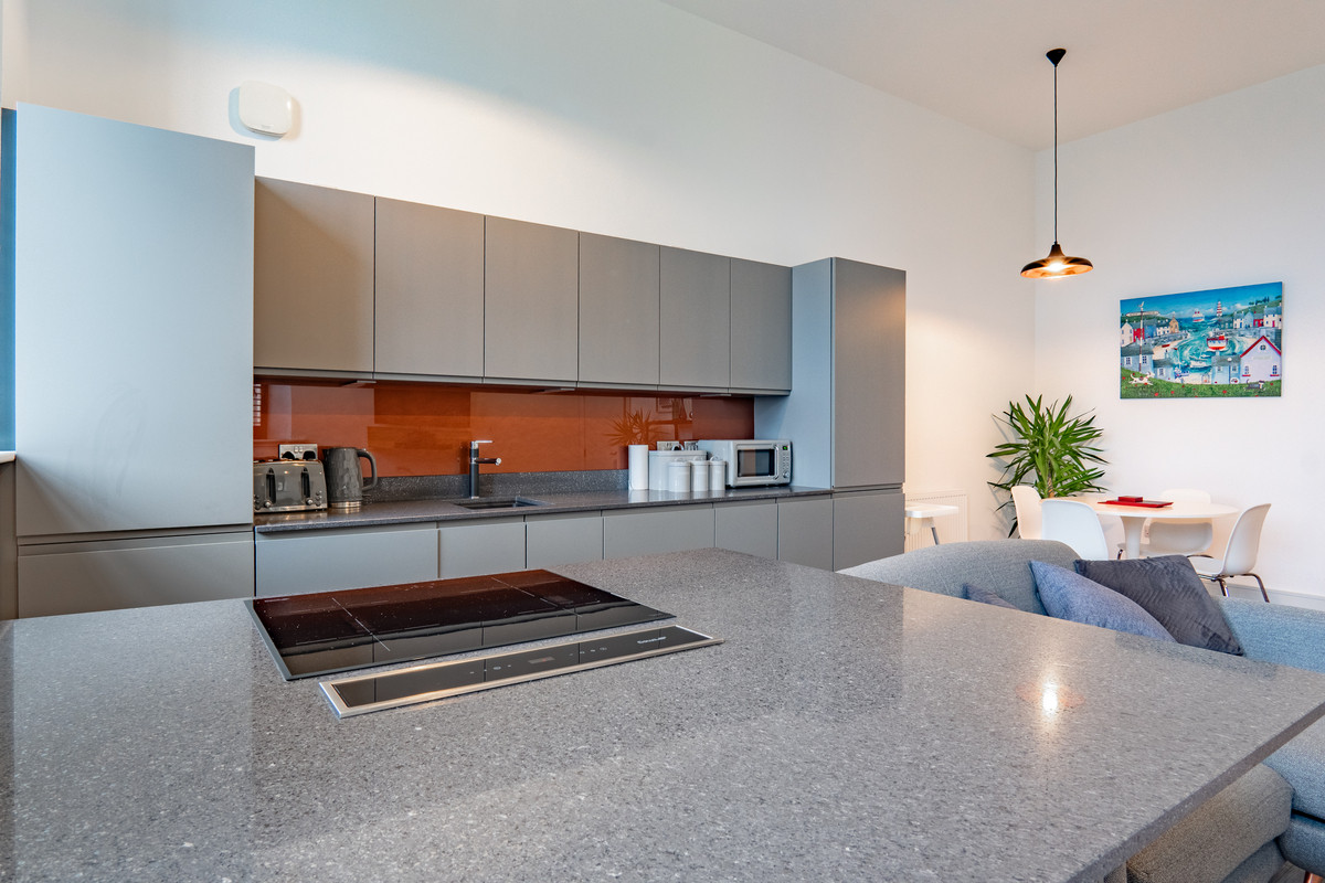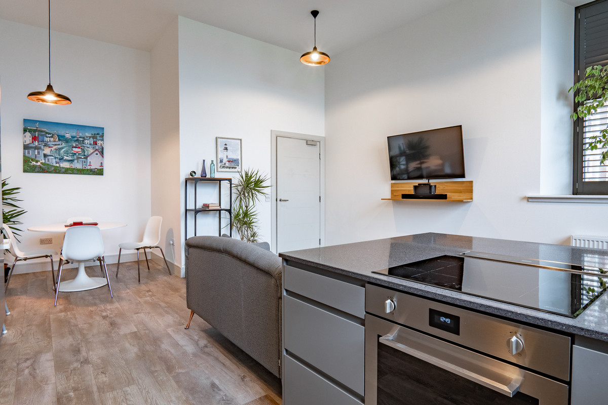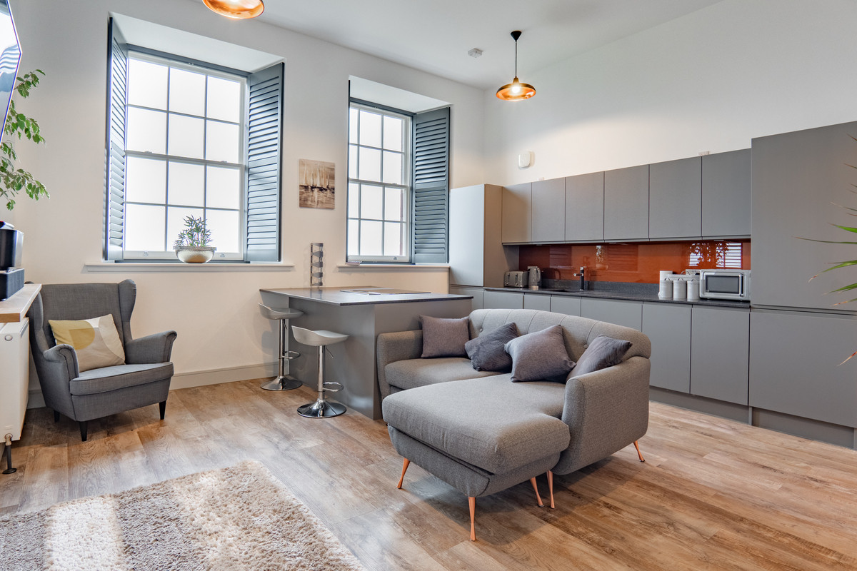 The heart of the flat is the open-plan living space, a bright modern room with tall sash windows with internal shutters and original deep sills that hint at the building’s history. The layout works really well, with the lounge area set beneath the windows and plenty of room for a sofa and chairs without feeling tight. The kitchen runs neatly along one wall with smooth grey cabinets and polished worktops, all finished to a high contemporary standard. An island with an induction hob and built-in oven below, creates a natural divide between the cooking and seating areas, adding extra workspace as well as a casual spot for breakfast. There’s space for a dining table beside it too, keeping everything easy to use and sociable.
