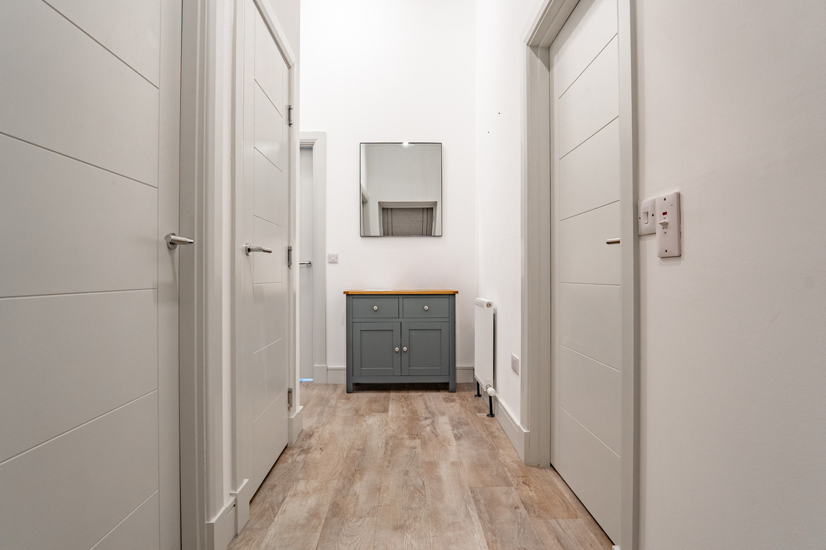 The front door to the apartment has a smart, modern grey textured finish that contrasts nicely with the traditional stone building it sits within. It opens into the flat’s own bright, white hallway setting the tone for the standard of the apartment.
