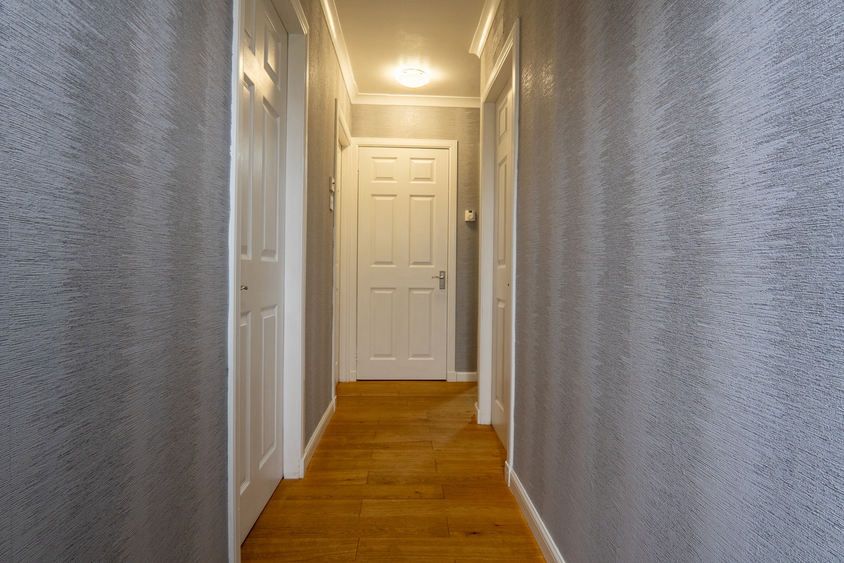 The entrance hallway sets a welcoming tone, finished with wooden flooring, grey walls and crisp white detailing to skirting, cornicing and internal doors. The living room is a bright and comfortable space, decorated with white walls accented by a bold green feature wall. A thick grey carpet provides warmth underfoot, a large radiator keeps the room cosy while a wide window draws in natural light. There is plenty of room here for sofas and other furniture, creating a relaxing central hub.
