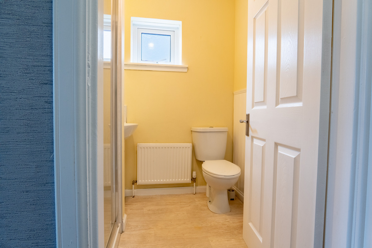 The shower room is designed for convenience, with cream painted walls and a white suite of toilet, hand basin and shower cubicle. Inside the cubicle, an electric shower with a fold down seat adds practicality. A frosted window, wall cabinet and a slim radiator ensure the space is bright, useful and easy to maintain.