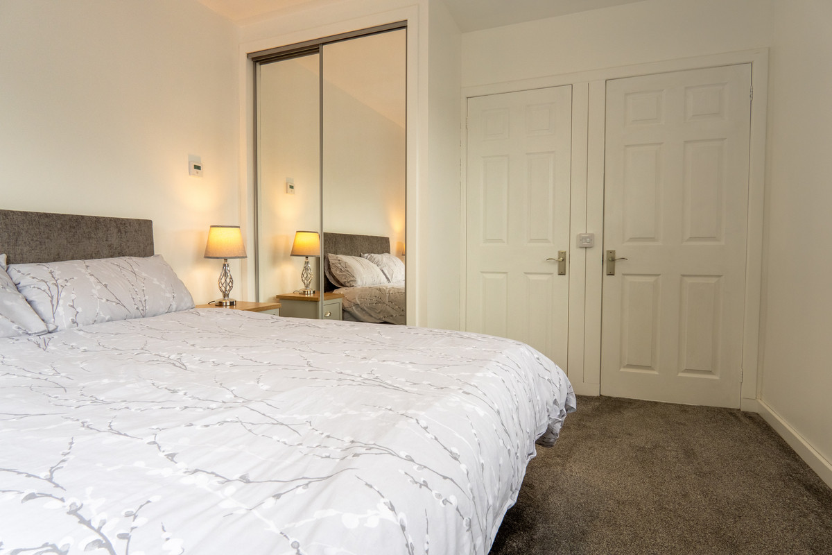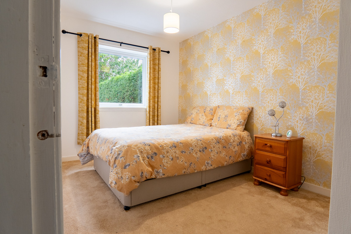 The first bedroom is a good size double, decorated in white with a leafy patterned feature wall in yellow and grey tones. A built-in wardrobe with wooden doors provides useful storage while a light carpet and radiator complete the space.