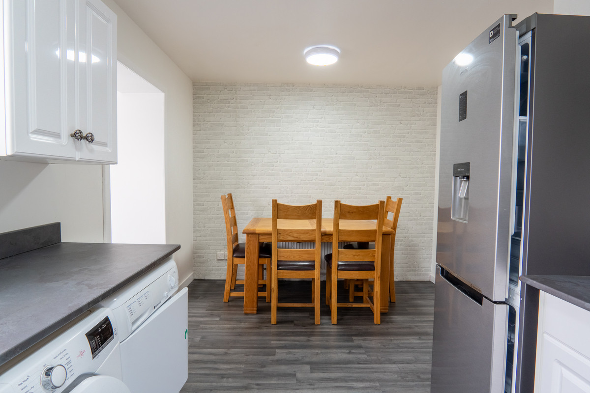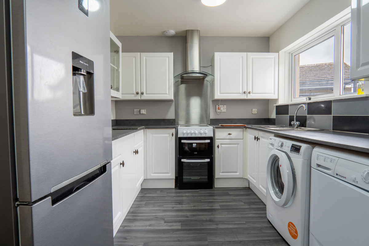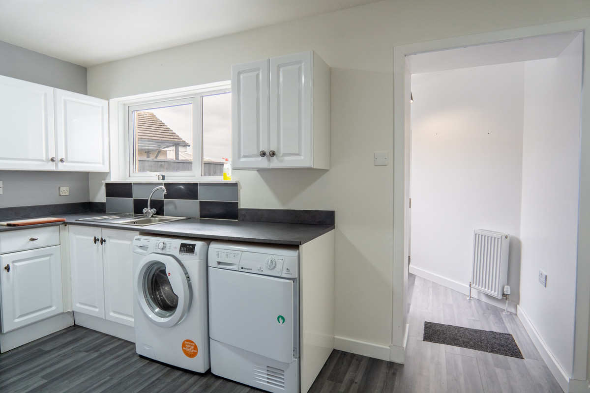 The kitchen is finished with crisp white cabinets, grey worktops and a stainless steel sink beneath a window. A feature wall in a white brick design adds character, while grey laminate flooring ties the space together. There is room here for a dining table and chairs, making it practical for everyday meals. Space is provided for a freestanding cooker with extractor above, along with space and plumbing for a washing machine.