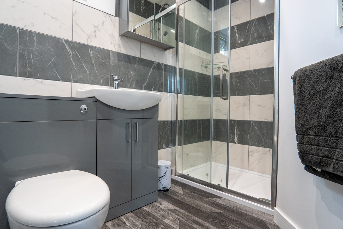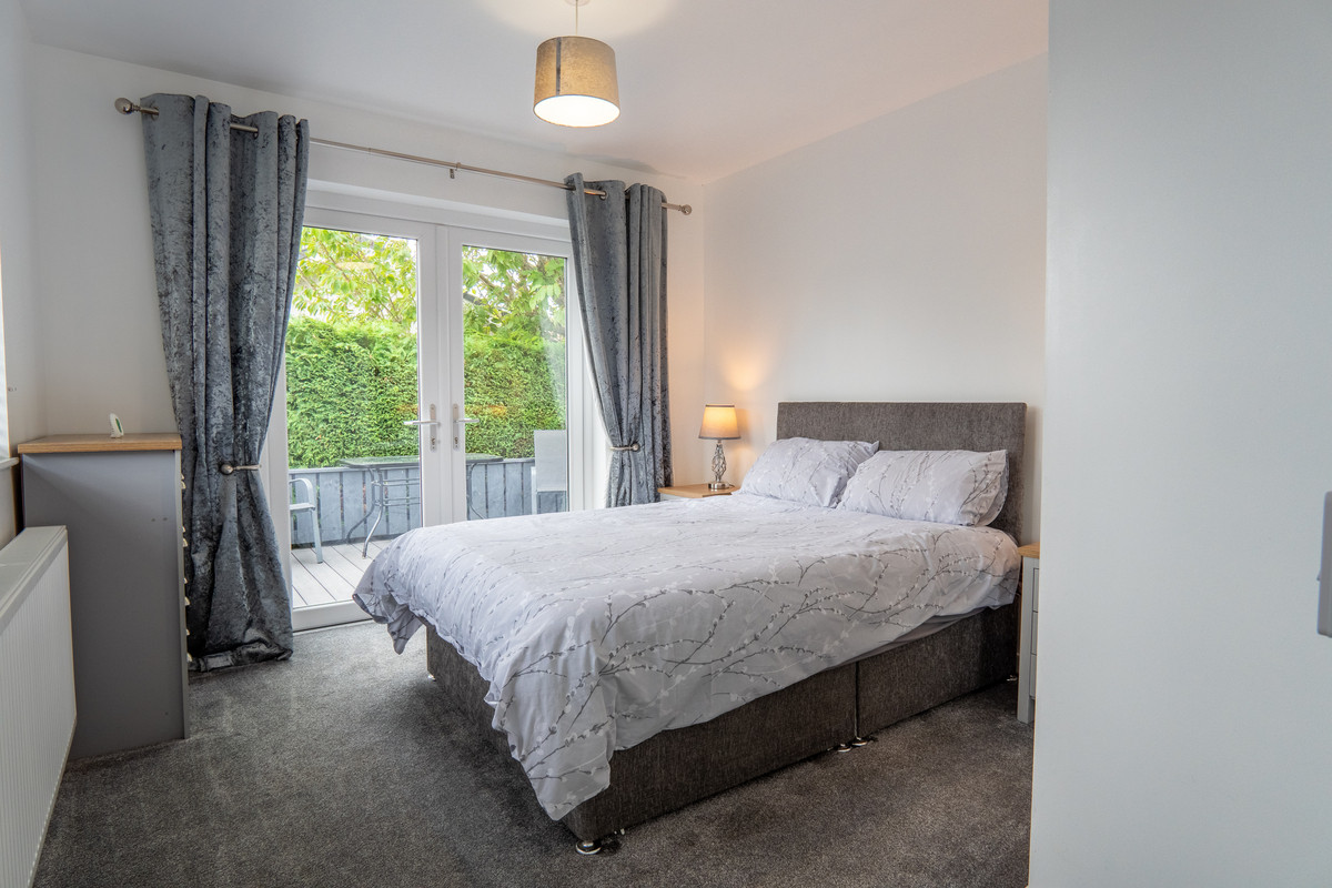 From the kitchen, the master bedroom is accessed. This large double room was added during the 2023 extension, providing an impressive suite with white painted walls, a thick grey carpet and a radiator beneath a window to the side. French doors open directly onto the rear garden decking, creating a bright and relaxing retreat. The room also enjoys a built-in wardrobe with mirrored sliding doors which adds useful storage. The en-suite shower room is finished to a high standard with modern fittings. A large rainfall head shower is set within a spacious cubicle lined in grey and white marble effect tiling. A white toilet and wash basin are built into a sleek grey storage unit, with a mirrored cabinet above and a chrome ladder radiator to the side completing the design.