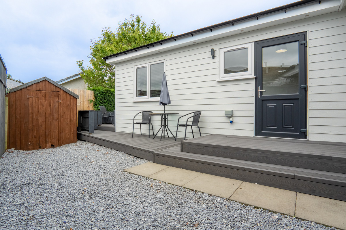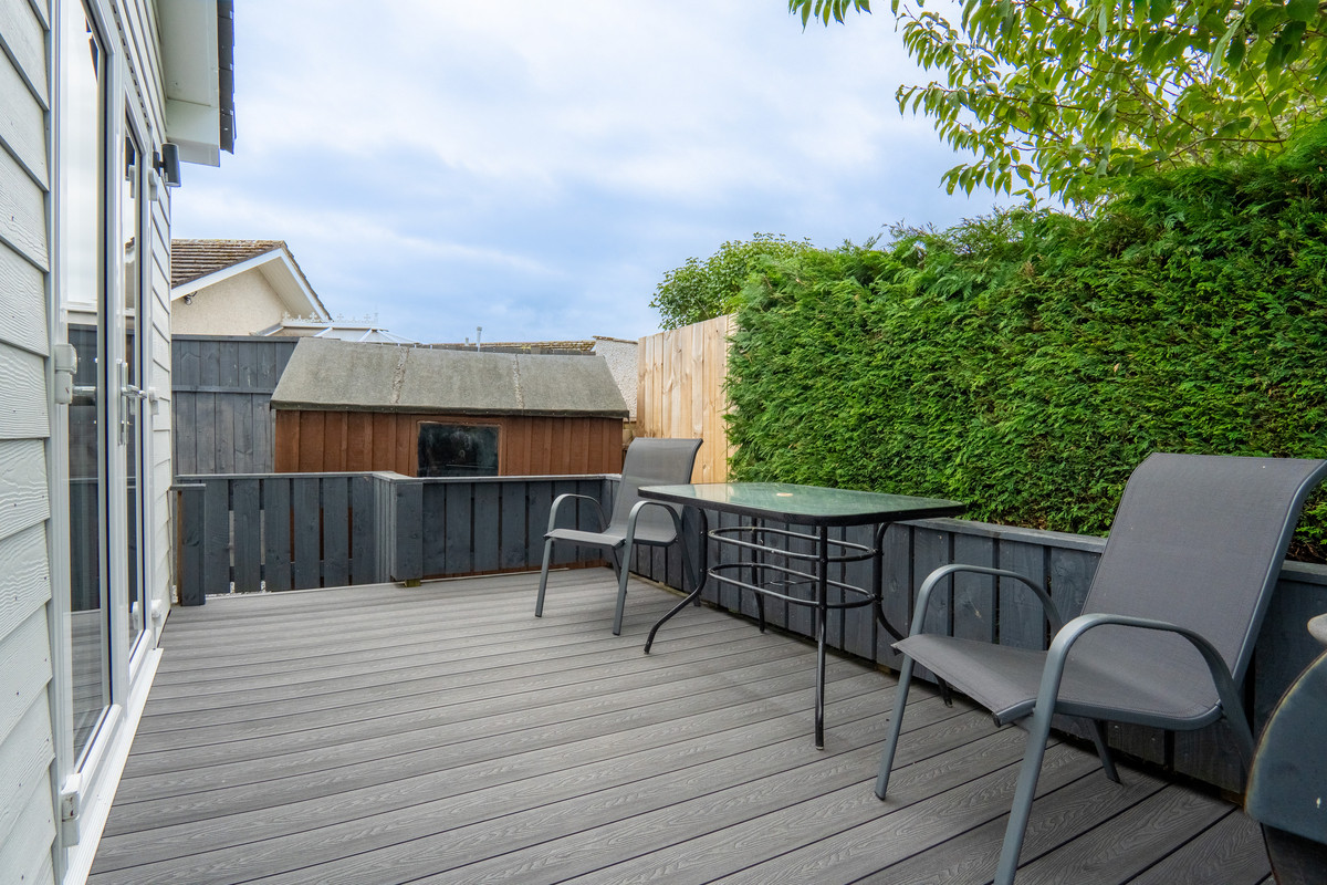 Outside, the property benefits from low maintenance gardens to the front and rear. The front is laid with chips and paving, with a driveway providing parking on a hardstanding area. The rear features the generous timber deck, a timber shed, outside tap and external power sockets which all add to the convenience. Boundaries are formed with fencing and hedging for privacy.