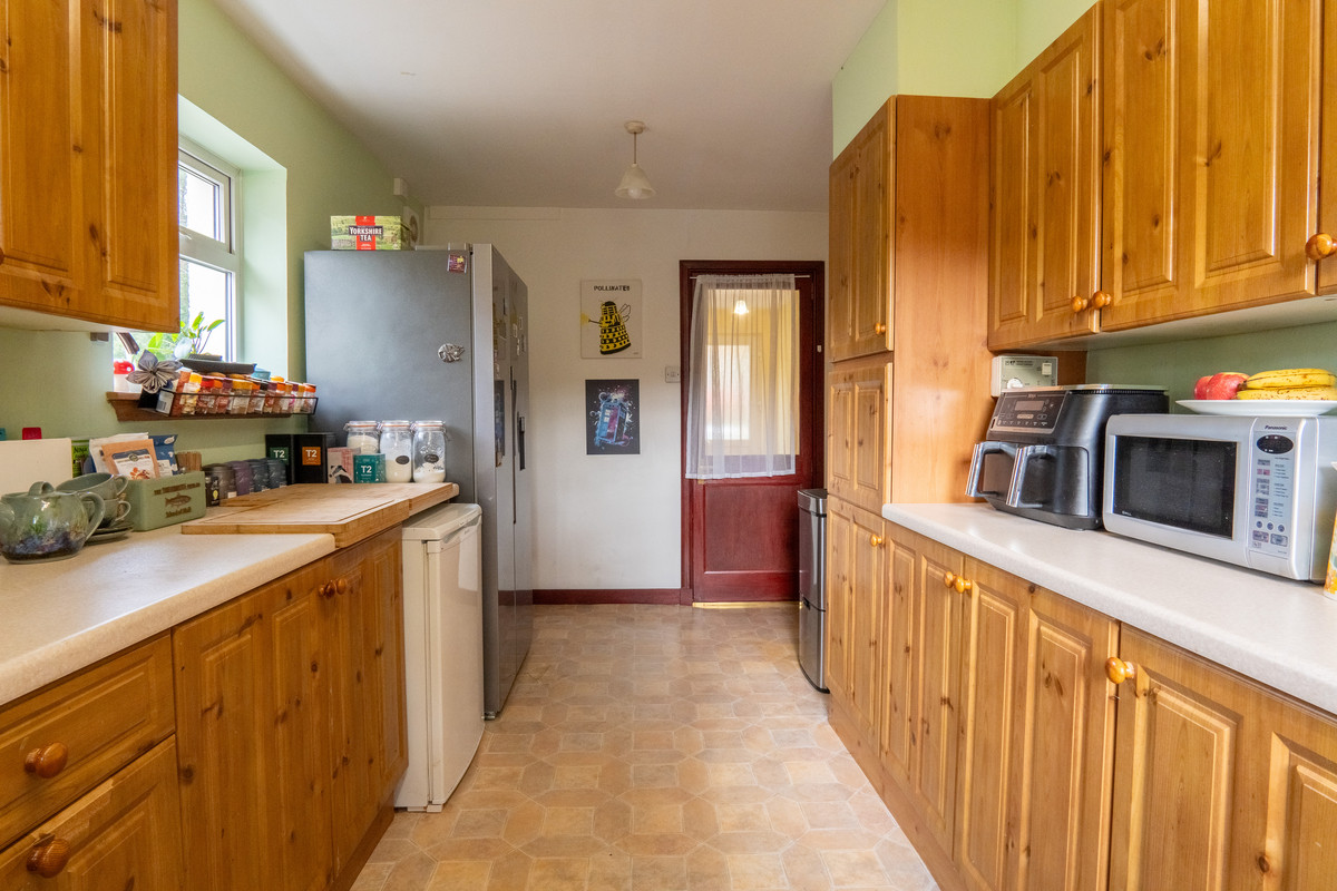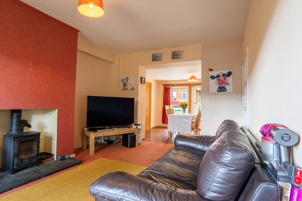 Stepping into the living room you’re greeted by a comfortable space anchored by a wood-burning stove set within a fireplace on a black hearth. The neutral cream walls are brightened by a bold feature colour on the chimney breast, tying in with the carpet. A wide front window brings in light, while the size of the room easily accommodates sofas, chairs and additional furniture.