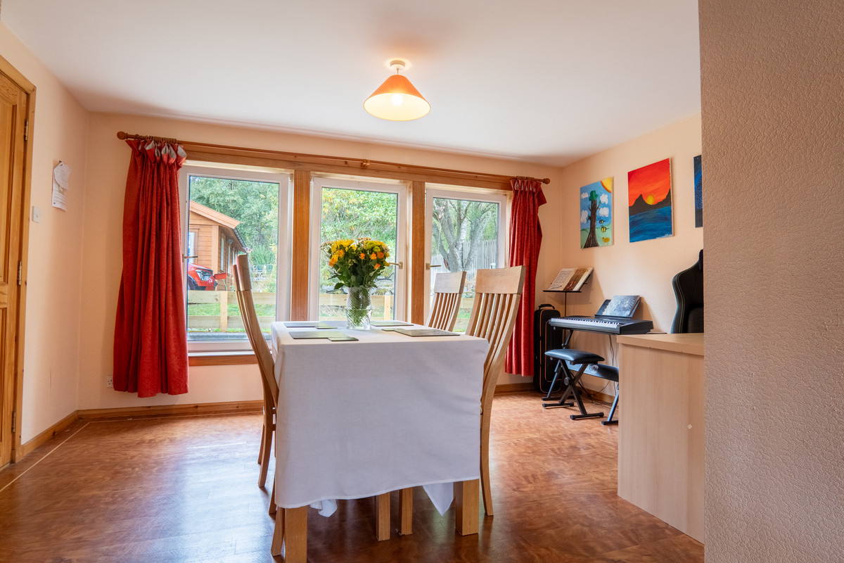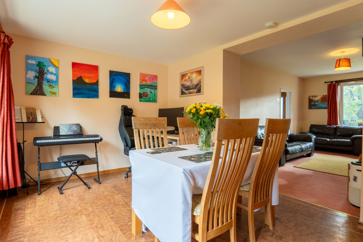 At the rear, the dining area is neatly defined, finished with wooden flooring and cream walls. A rear facing window ensures a bright outlook over the garden, creating a pleasant spot for everyday family meals or more formal gatherings.