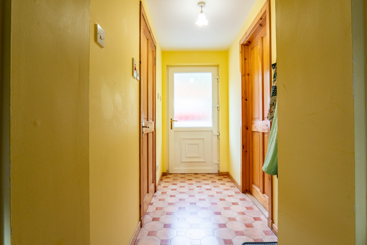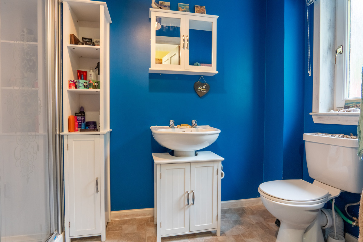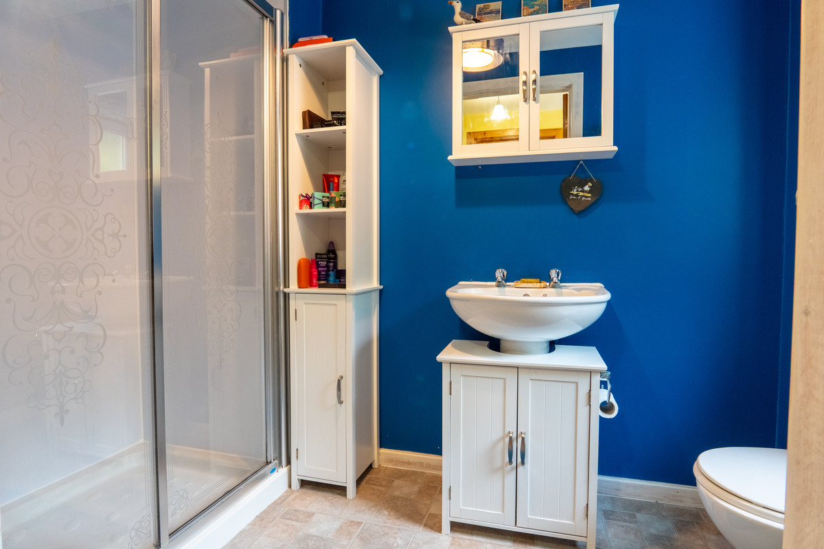 A small hallway leads off the kitchen, giving access to the shower room. Here, striking blue walls add vibrancy, offset by light vinyl flooring. The suite is modern in style, with a toilet, hand basin and shower cubicle fitted with an electric shower. A frosted window brings light while retaining privacy.