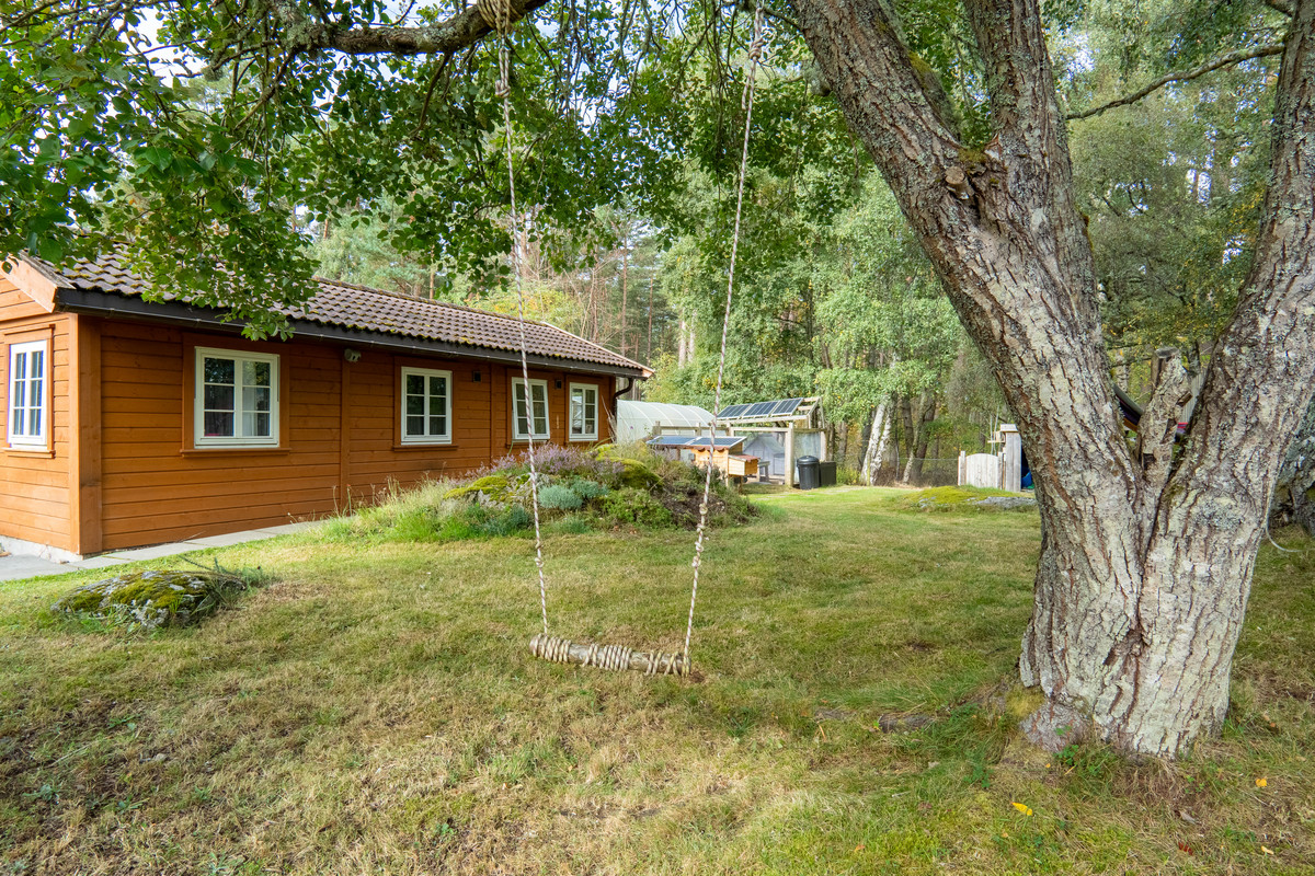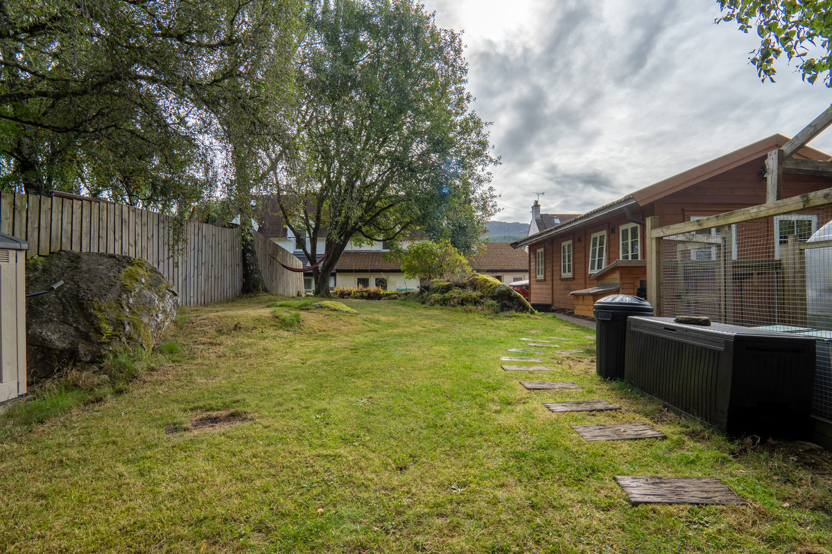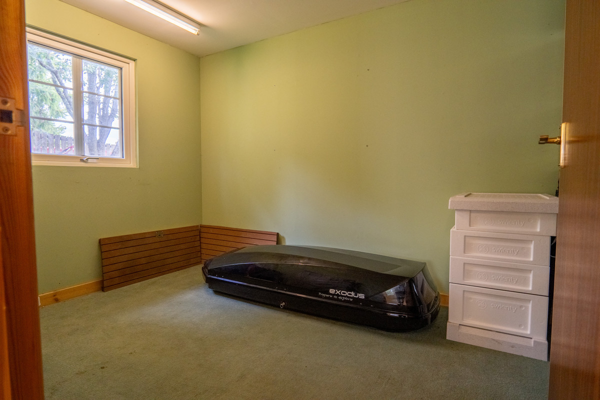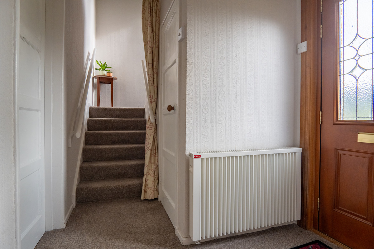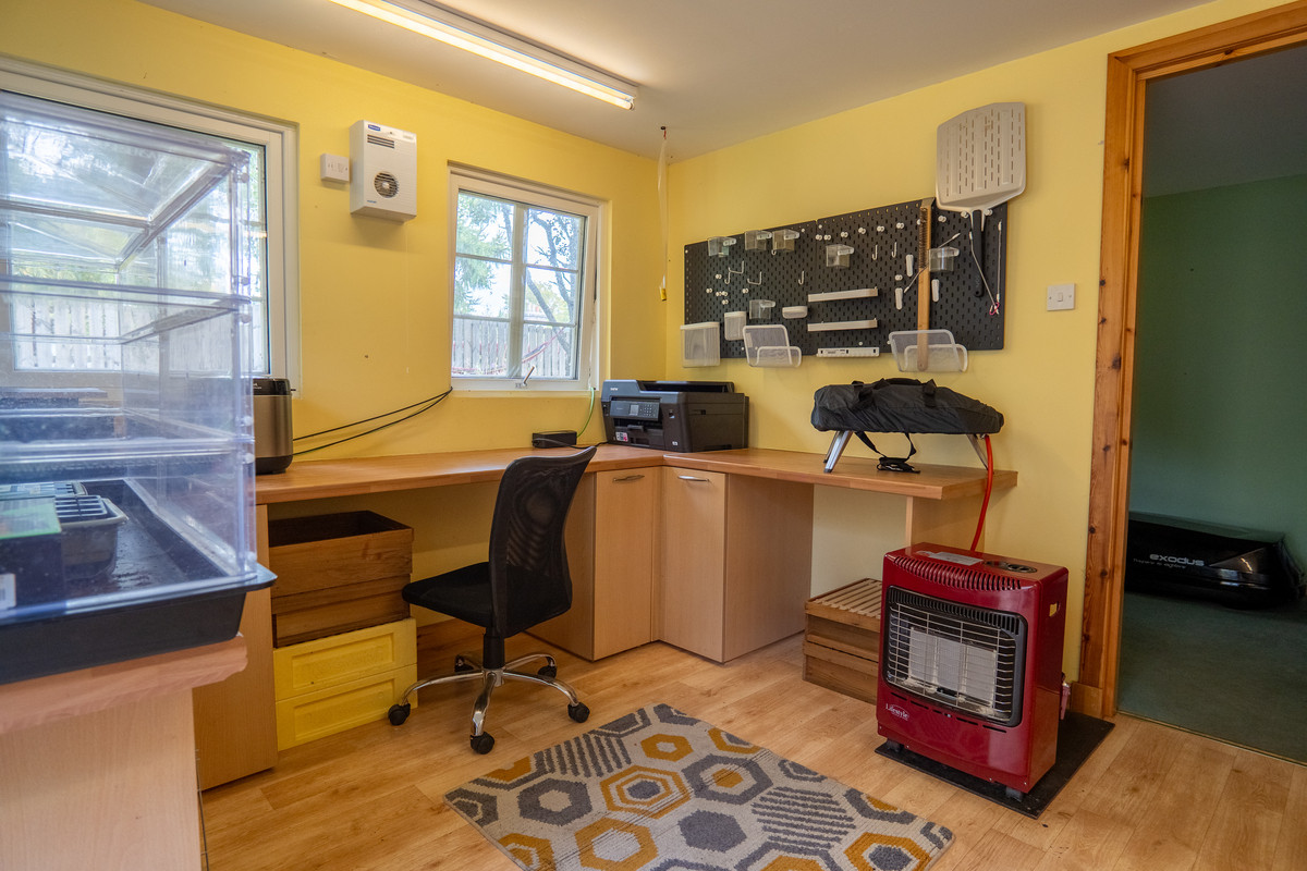 Outside, the property sits within generous gardens to the front, side and rear, combining lawn, paving, stone chips and planting. Mature trees add both colour and privacy, while the boundaries are secured by a mixture of fencing and hedging. A chip-stone driveway provides off street parking, while a timber outbuilding with power and light offers scope for a workshop, studio or practical storage.