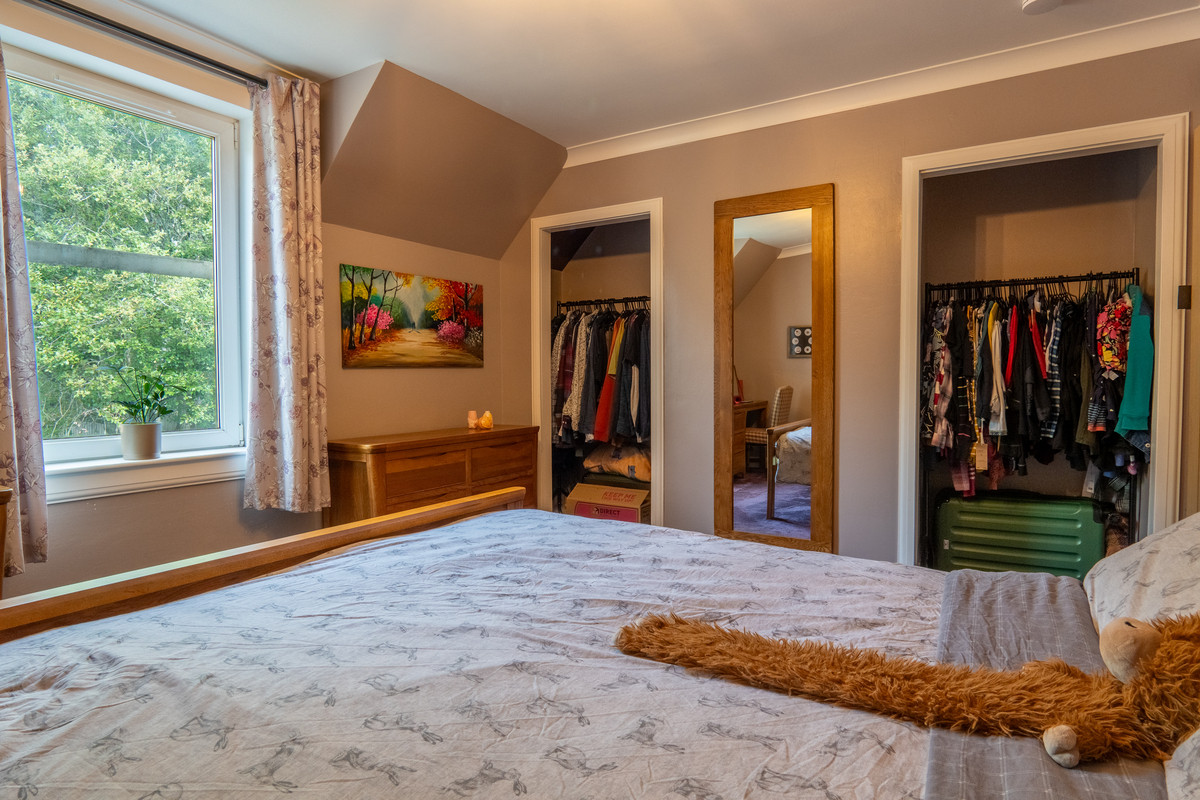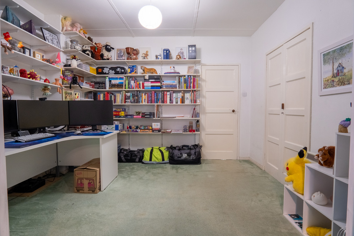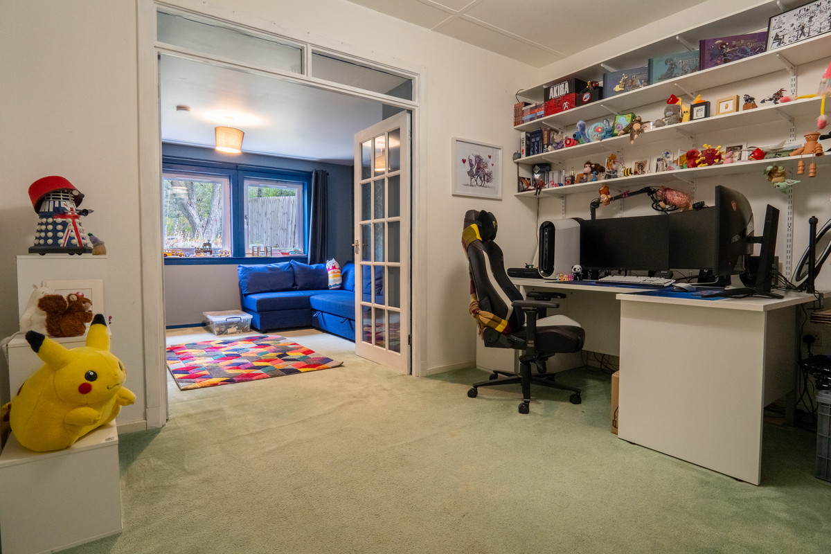 Adjoining through double glazed doors, the office provides an additional dimension. Currently fitted with shelving and a built-in cupboard, it is finished in white with the neutral carpet continuing from the bedroom. This adaptable room could be used as a work from home office, library, playroom or hobby area, or the two spaces could be opened up to create a larger suite.