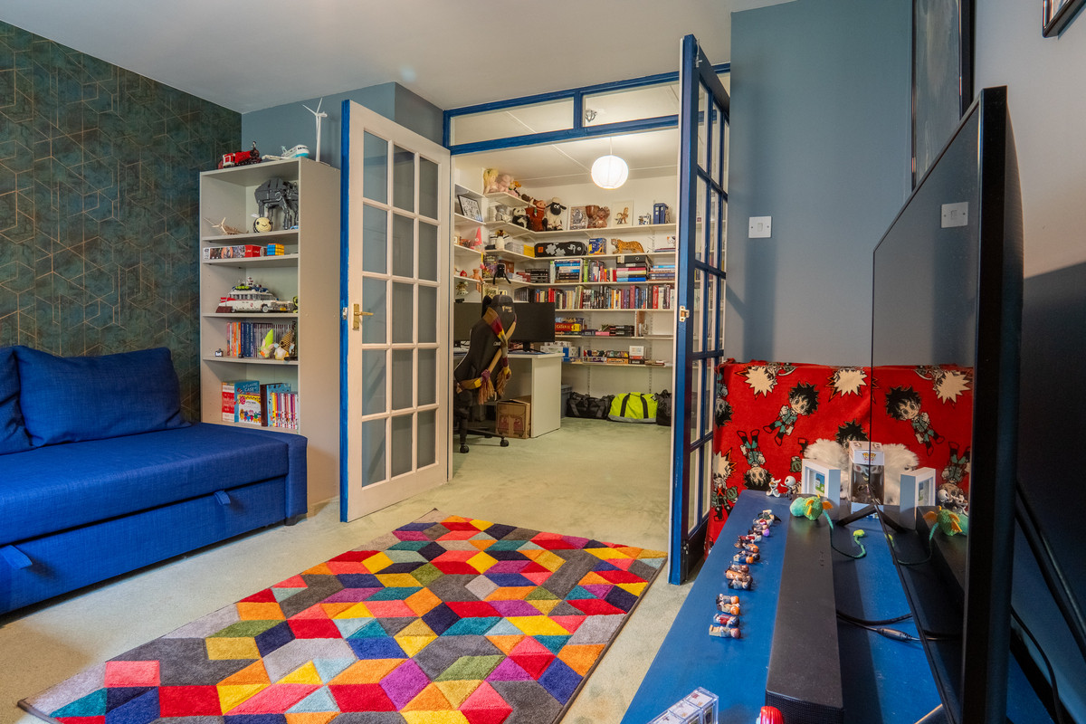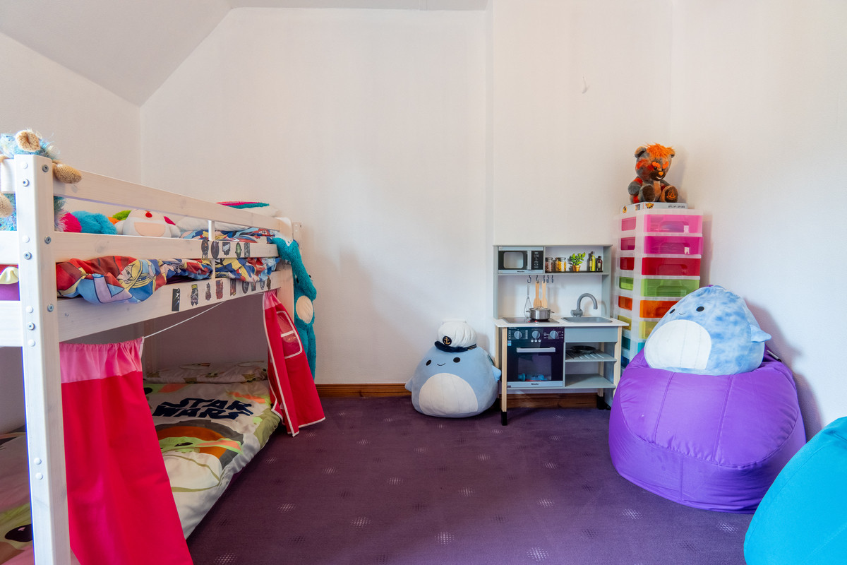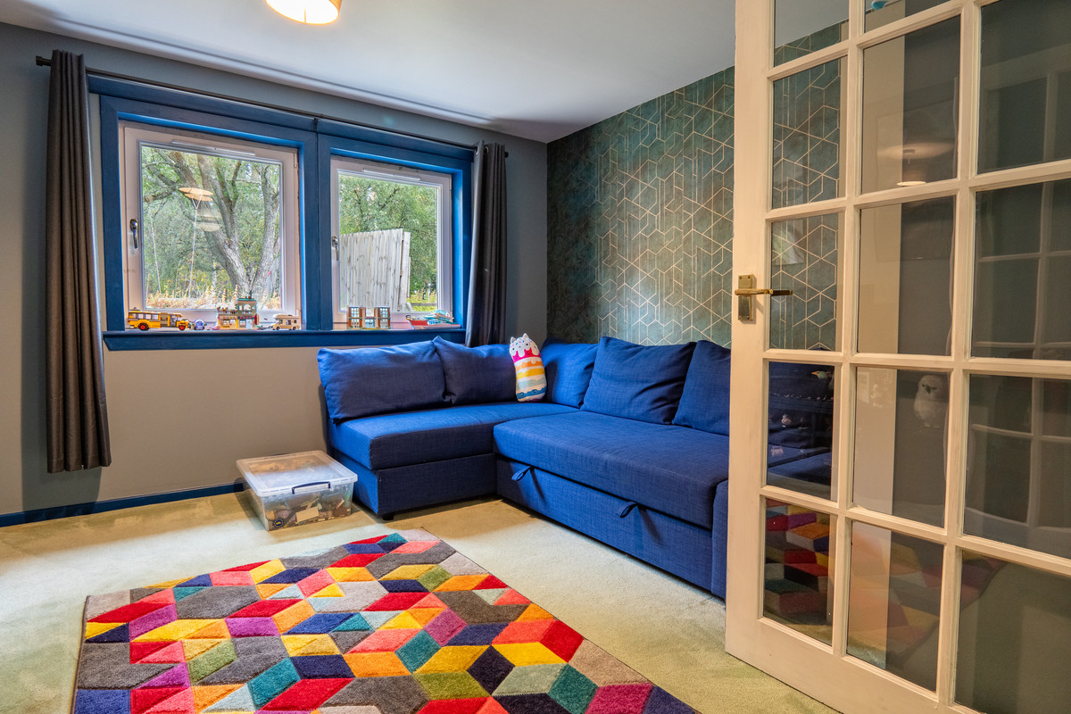 Also on the ground floor are two further rooms that provide real flexibility. The double bedroom is a good size, decorated with light grey walls and a striking feature wall with geometric patterned wallpaper. The skirting and window frame are painted in a bold blue tone that also adds flair. There is plenty of space for a bed and accompanying furniture, making this a comfortable retreat.