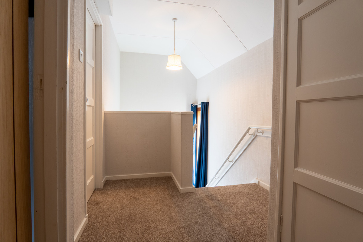 The second bedroom upstairs is also a double with a purple carpet and light coloured decoration. A built-in cupboard offers useful storage, while a window brightens the space and a heater near the door provides warmth.