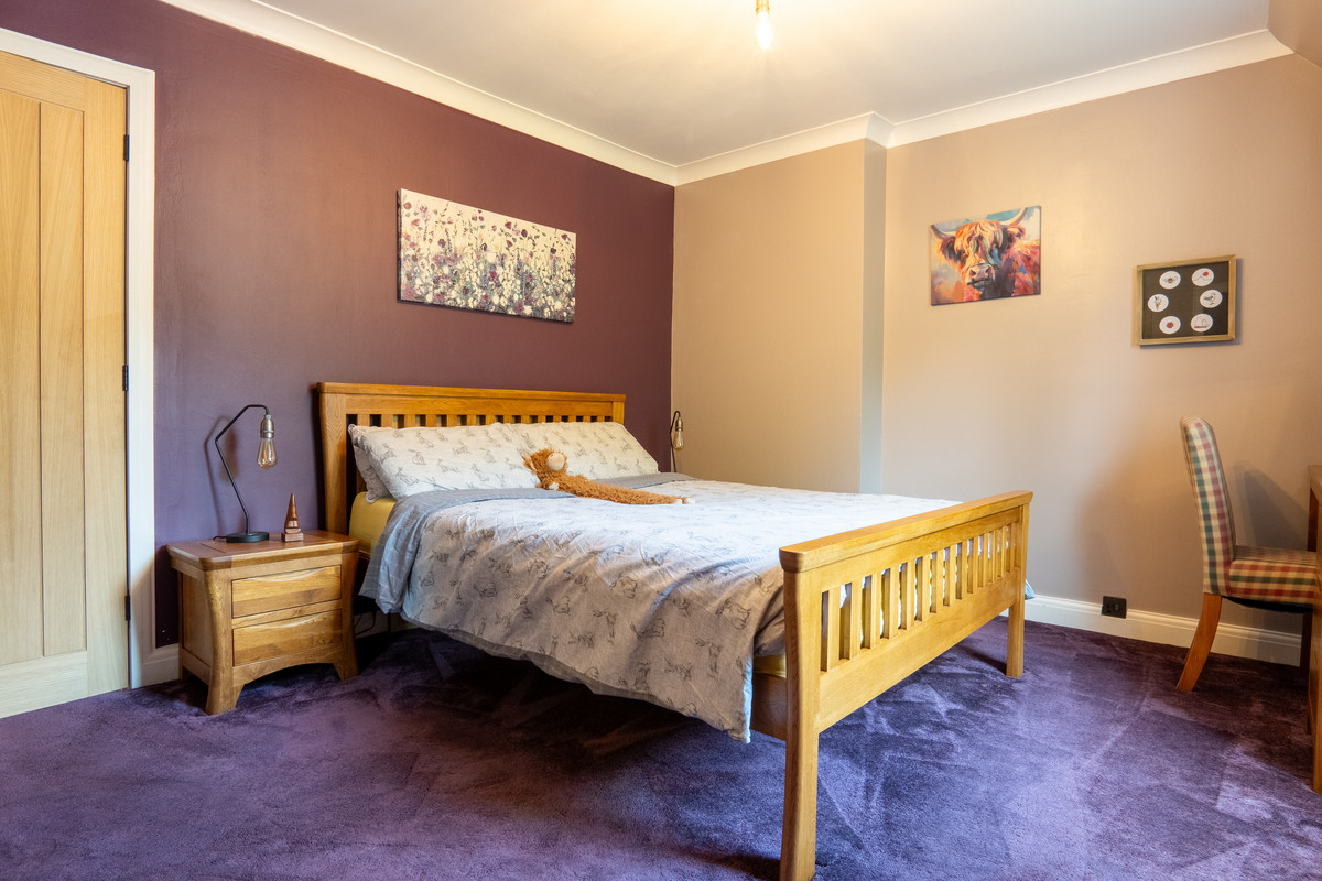 The staircase rises from the main hallway, with grey carpet flowing up and onto the first-floor landing. The first of the upstairs bedrooms is a large double decorated with light coloured walls and a feature wall in deep purple to match the plush carpet. A wide window floods the room with light, while open fronted recesses provide practical storage solutions.