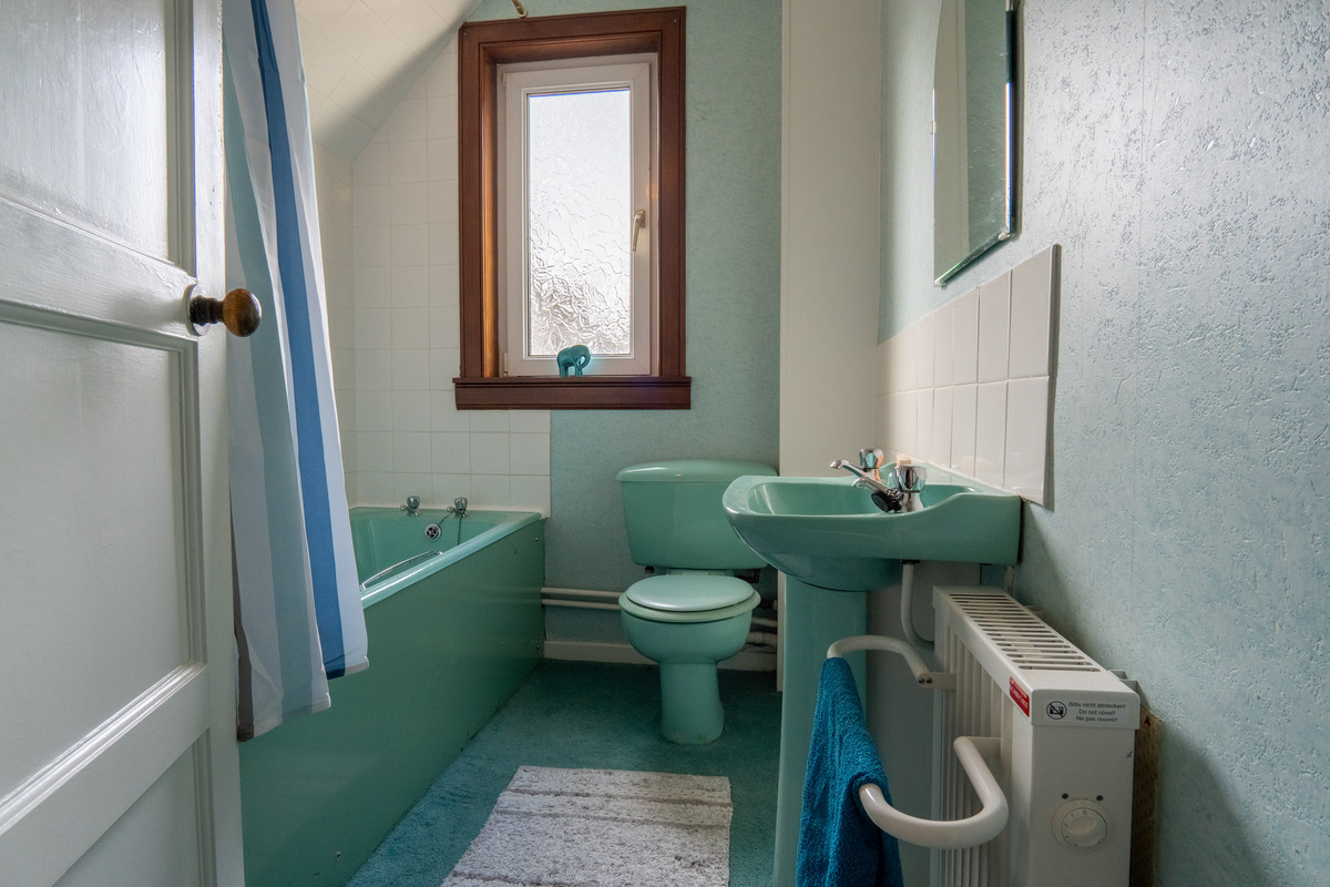 The bathroom completes the upper level. A coordinated light green suite includes a bath with electric shower above, a toilet and sink. White tiling surrounds the bath area for easy maintenance, while a slim frosted window allows natural light into the room.