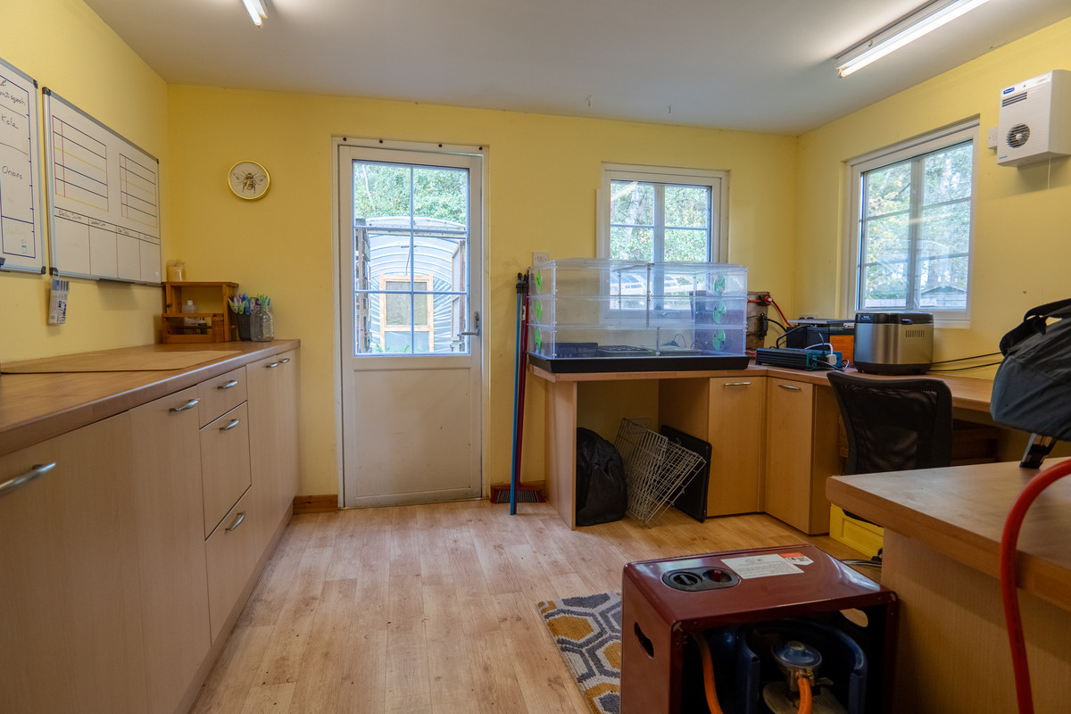 The kitchen leads off from the living space and has a cheerful, functional feel. Wooden cabinets line the walls, both floor and wall mounted, topped with light-coloured laminate worktops. A pale green feature wall adds character, while a stainless steel sink sits beneath the window for a pleasant outlook. Space is provided for a free-standing cooker, along with under counter plumbing for both a washing machine and dishwasher.