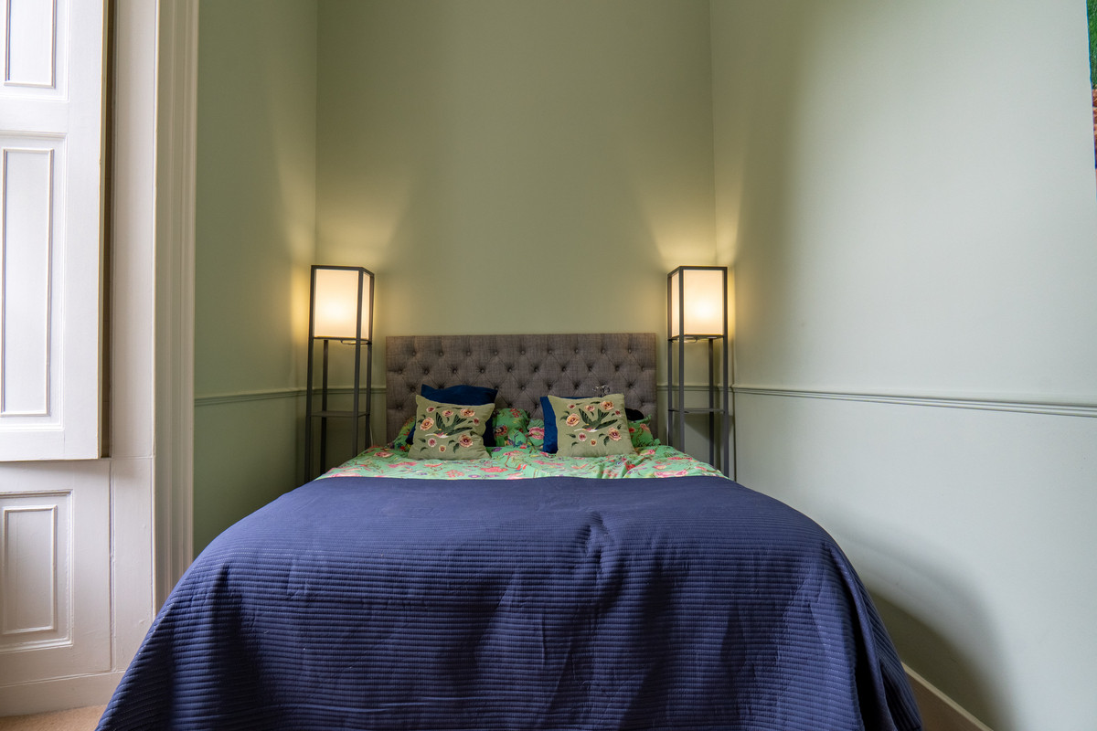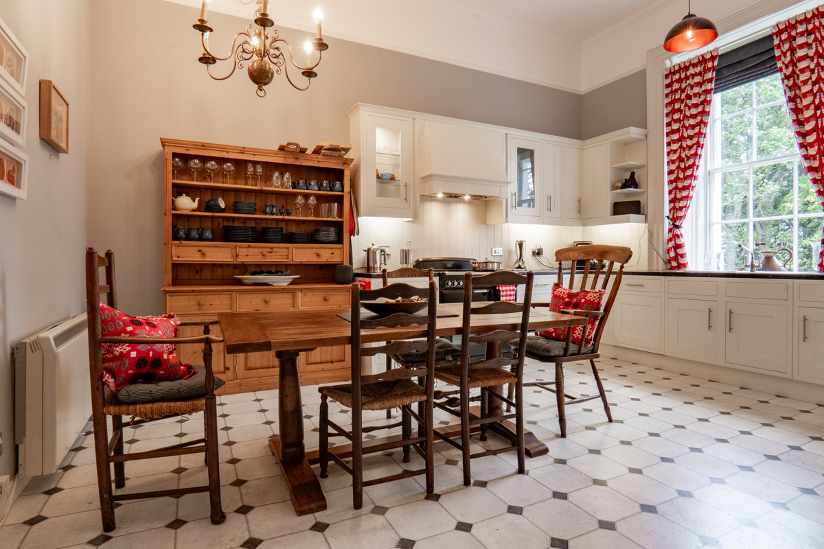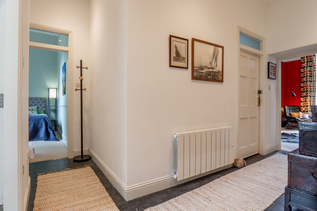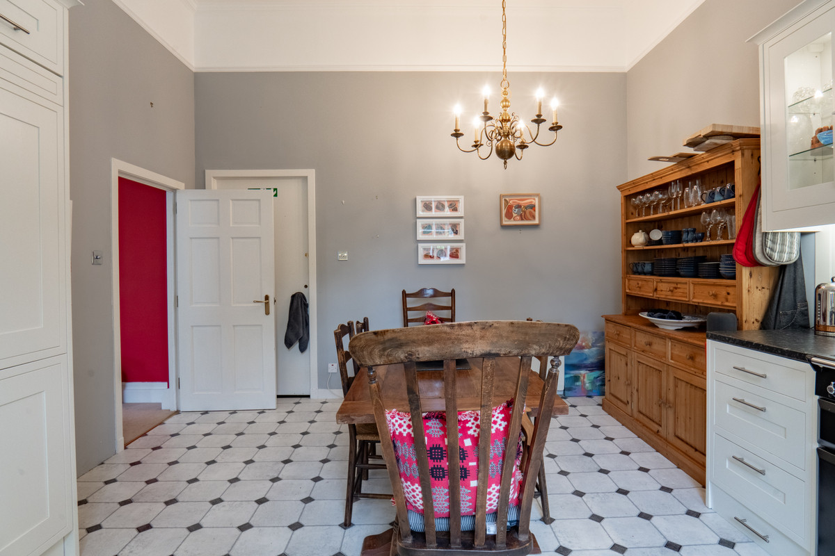 A shared hallway leads into the property, where the sense of character becomes immediately apparent. The lounge is a particularly impressive room, featuring a large decorative white fireplace with a solid fuel stove set within. Tall sash windows fill the space with natural light while the low window sills create inviting spaces to sit and enjoy the outlook over the gardens. It also enjoys high ceilings with ornate cornicing which enhances the room’s grandeur. Red painted walls provide a bold backdrop softened by a cream carpet underfoot.