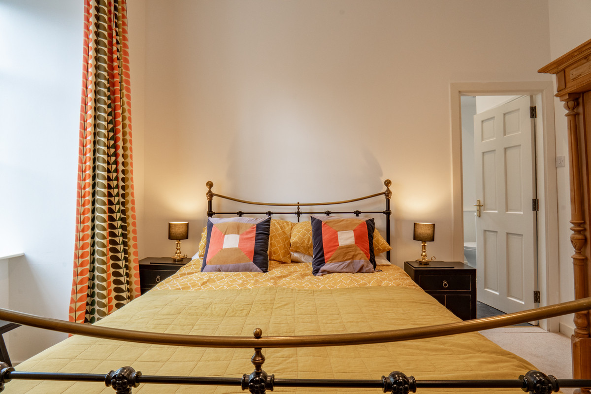 The master bedroom is another highlight with tall ceilings and a large window. The room’s dimensions provide plenty of space for a large bed and additional furniture. Its private en-suite bathroom adds a luxurious touch, finished with a freestanding roll-top bath, a separate shower enclosure with rainfall head and a sink set on top of a small storage cupboard. A chrome ladder radiator and toilet complete the fittings, blending period style with modern convenience.