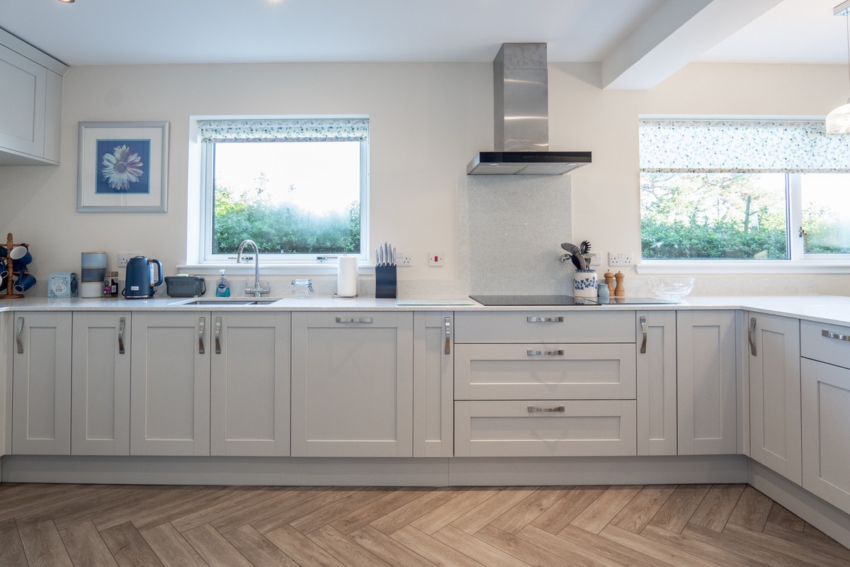 To the left, you enter the stunning open-plan kitchen, dining and family room. This space has been thoughtfully designed for both daily living and entertaining, with generous proportions and a clear sense of flow. The kitchen itself has been recently upgraded with modern shaker style units in a soft light colour, topped with gleaming quartz worktops. A stainless steel sink is positioned below one of two windows, and integrated appliances are neatly built in throughout. A Haier American-style fridge freezer sits alongside twin Bosch ovens, while a built-in wine chiller adds a touch of luxury beneath the breakfast bar.