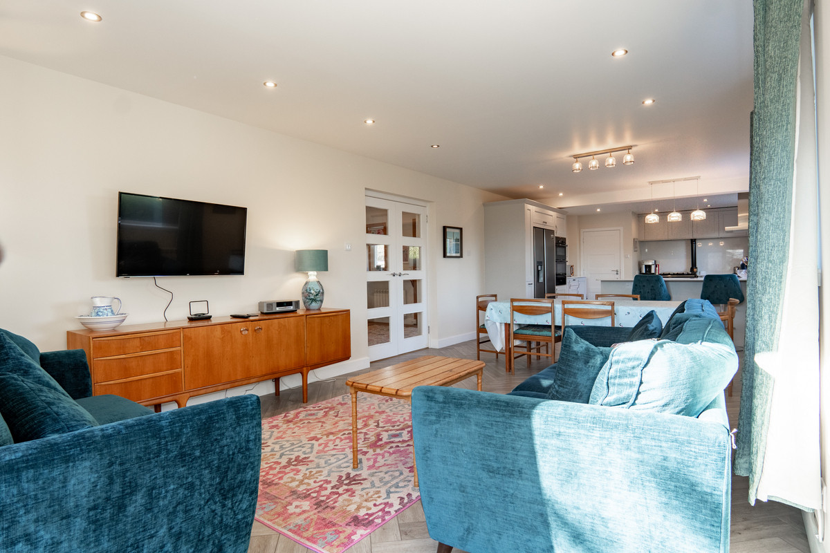 Beyond the kitchen, the family space is bathed in natural light, thanks to both a side window and large glazed sliding doors that open directly to the rear garden. The space is comfortably arranged with space for sofas, a sideboard and wall mounted TV. Between here and the kitchen set-up is a flexible dining space, currently hosting a six seater table beneath a window and flanked by a modern radiator.