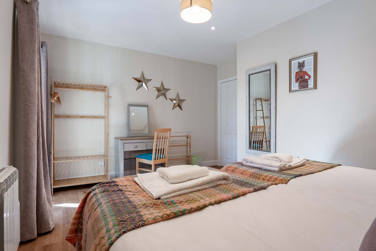Leading from the inner hallway and also accessible through glazed double doors from the sunroom is a beautifully presented double bedroom. The large set of French doors not only flood the room with natural light but also offer a charming view and access to the exterior. Thoughtfully styled with soft neutral tones and warm wooden flooring, the room feels calm and inviting. Practical touches such as a wall mounted radiator makes this an ideal guest room or serene retreat.
