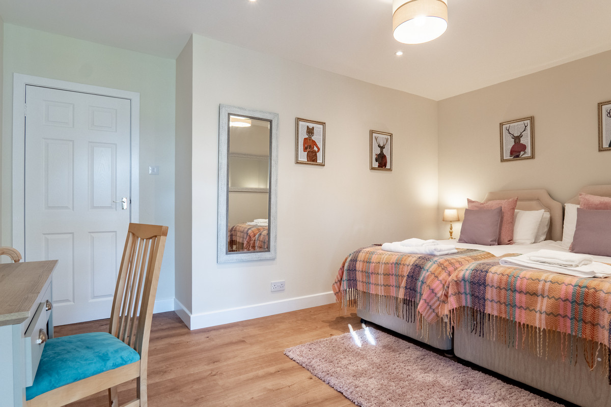 Soft lavender tones and floral accents give the fourth bedroom a calm and restful atmosphere, perfect for winding down. The wide window welcomes in plenty of natural light, enhancing the inviting feel. With space for a double bed, this room makes a great fourth bedroom for a family member or as a guest room for visitors.