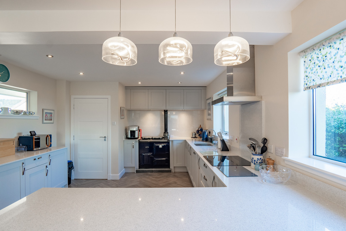Opposite, a striking navy Rayburn, supplied by a bulk LPG tank, is set into a dedicated alcove, acting as both a practical cooker and an attractive focal point. Pendant lighting defines the breakfast bar area, with plush velvet bar stools adding a pop of colour that echoes the colour scheme used throughout the family area.