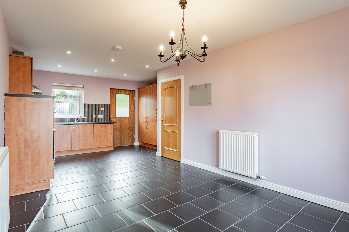 To the left of the hallway, the kitchen and dining room stretch the full depth of the home, filled with natural light from windows at both ends. The dining area has soft lilac walls that bring warmth and colour to the space, paired with a sleek black tiled floor that catches the light beautifully. A hanging decorative light fitting adds a touch of character overhead, while two radiators keep the room cosy year round. In the kitchen, wooden cabinets sit beneath dark counters, with matching black tile splashbacks along the walls. Built-in stainless steel appliances, including a double oven, gas hob and extractor hood, lend a polished, modern finish while a door to the rear provides direct access out to the garden.