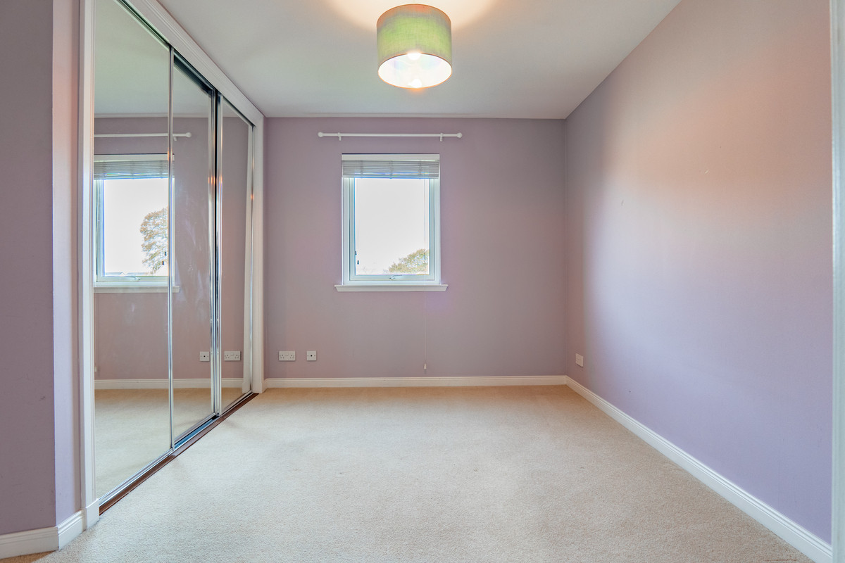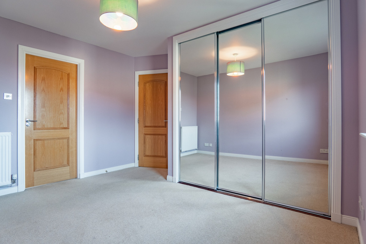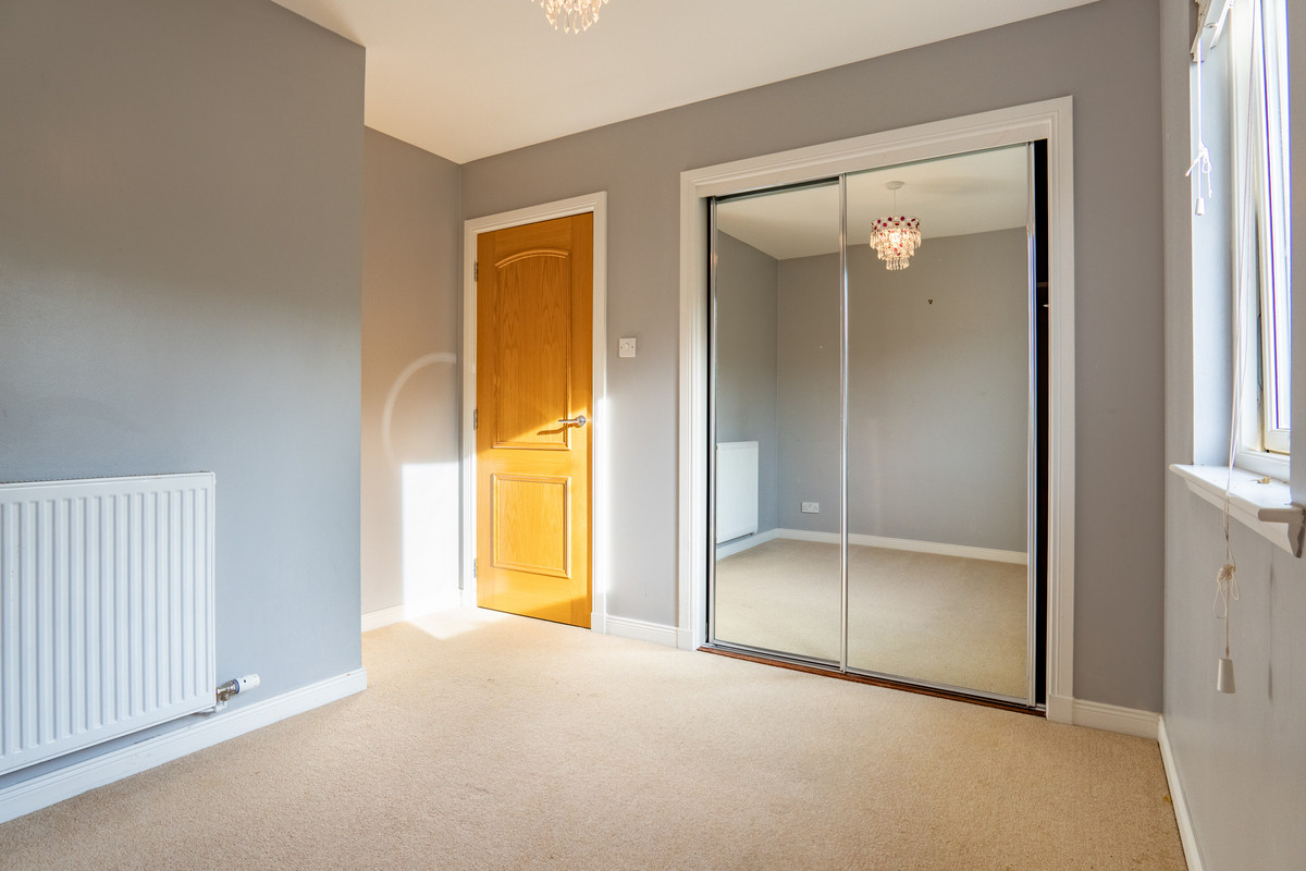 Bedroom three is finished in a soft grey tone that feels modern and understated. There’s a built-in mirrored wardrobe offering generous storage, and the simple layout makes it easy to furnish to personal taste. A radiator sits along one wall to keep the room cosy, while the light walls and neutral carpet give it a clean, fresh look.