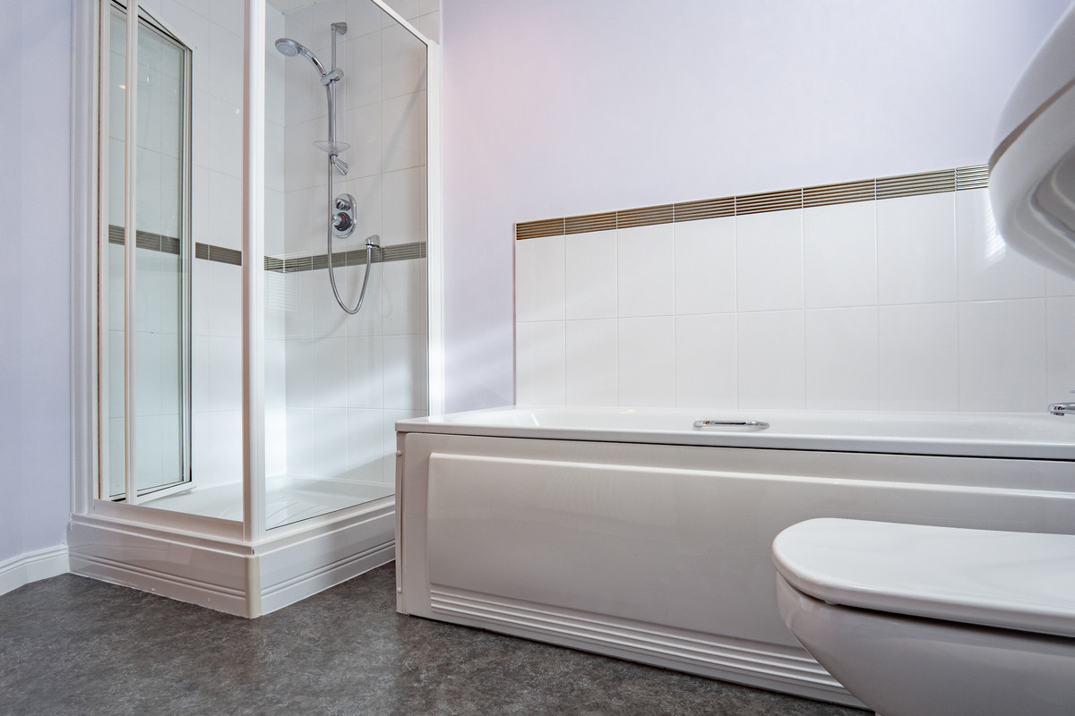 The main bathroom is bright and inviting, fitted with a modern four-piece suite. There’s a bath for when you want to unwind and a separate shower that’s perfect for busy mornings. Everything’s neatly laid out, with a pedestal basin and toilet completing the space in a clean, practical way.