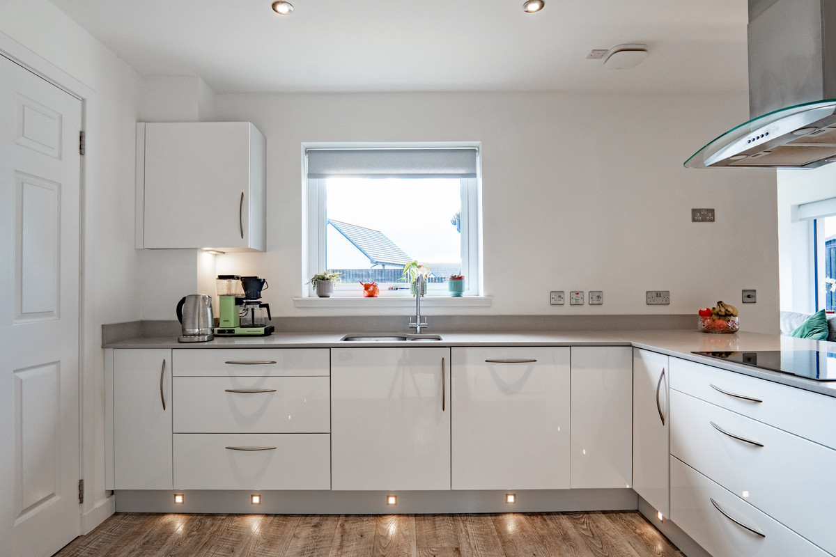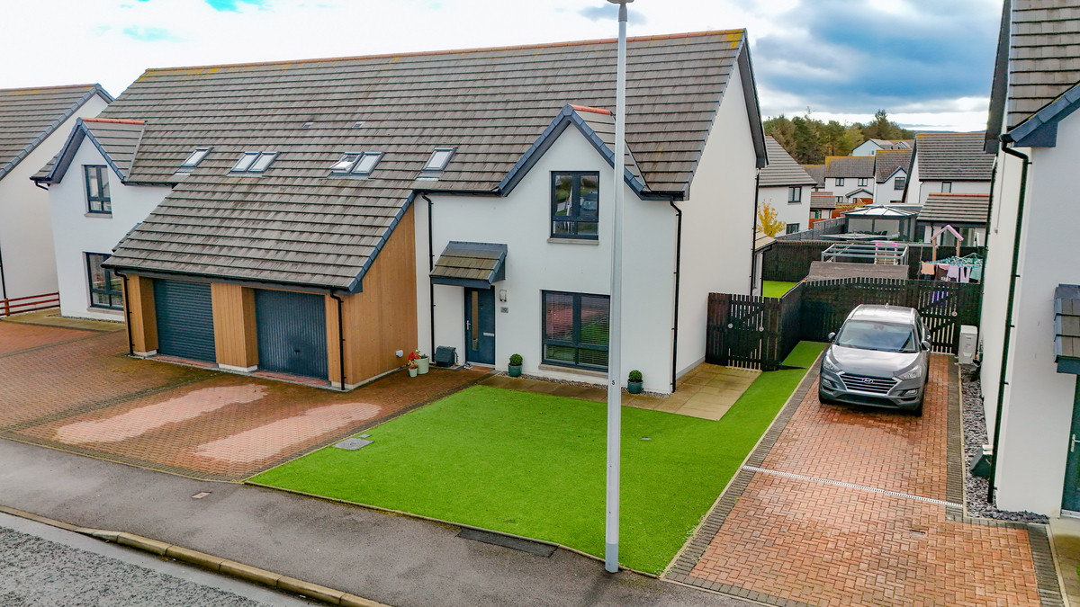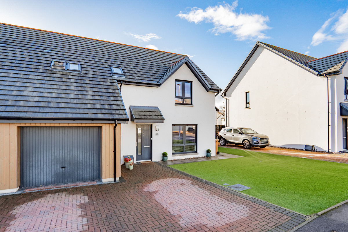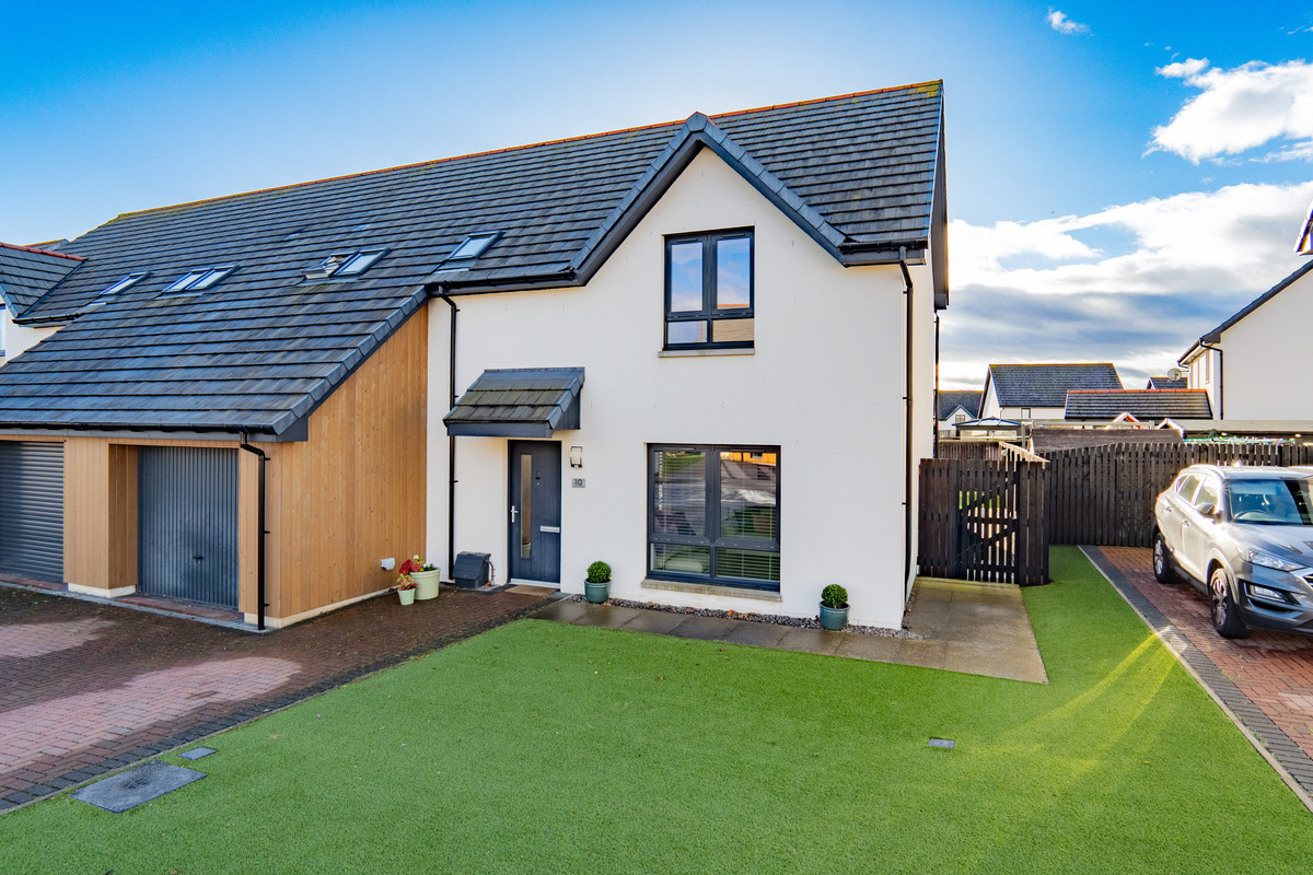 This modern semi-detached villa was built in 2018 by Springfield Properties and has the smart, contemporary look you’d expect from a recent build. The white render and timber detailing give it a crisp finish, while the dark framed windows and matching front door add contrast. A paved driveway sits alongside a neat, low maintenance front garden, with access leading to the garage. Inside, there’s around 134 square metres of space spread across two floors, including open-plan living areas and three comfortable double bedrooms. It’s a great home for families looking for a move-in ready home in a great Elgin location.