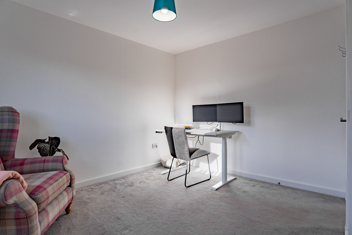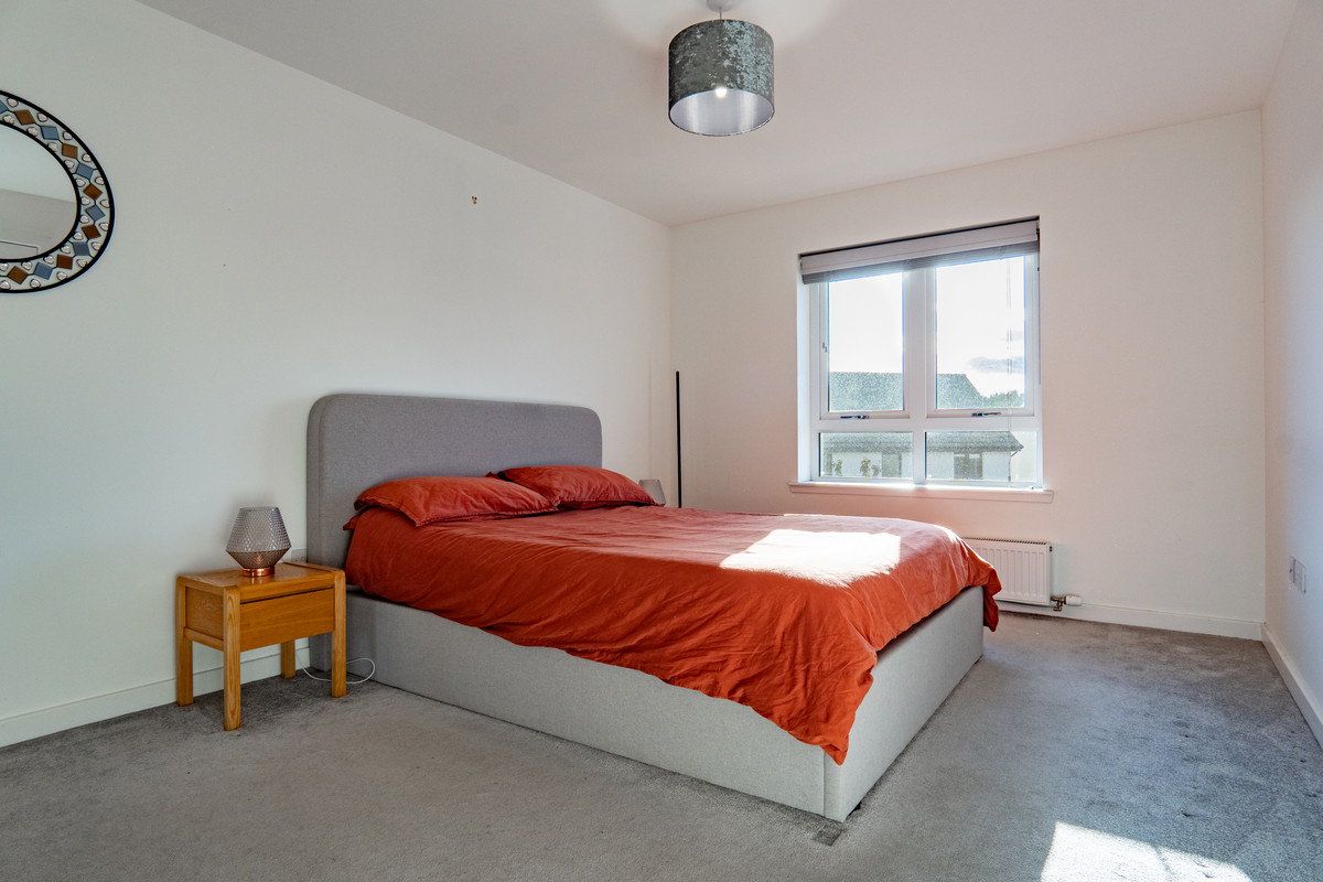 The third bedroom includes its own fitted mirrored wardrobe providing useful storage without intruding on the space. Like in the other bedrooms, soft grey carpet and white walls create a calm, neutral backdrop. A wide window allows light to fill the room, complemented by a compact radiator below. It’s an ideal setting for a guest room, child’s bedroom or home office.
