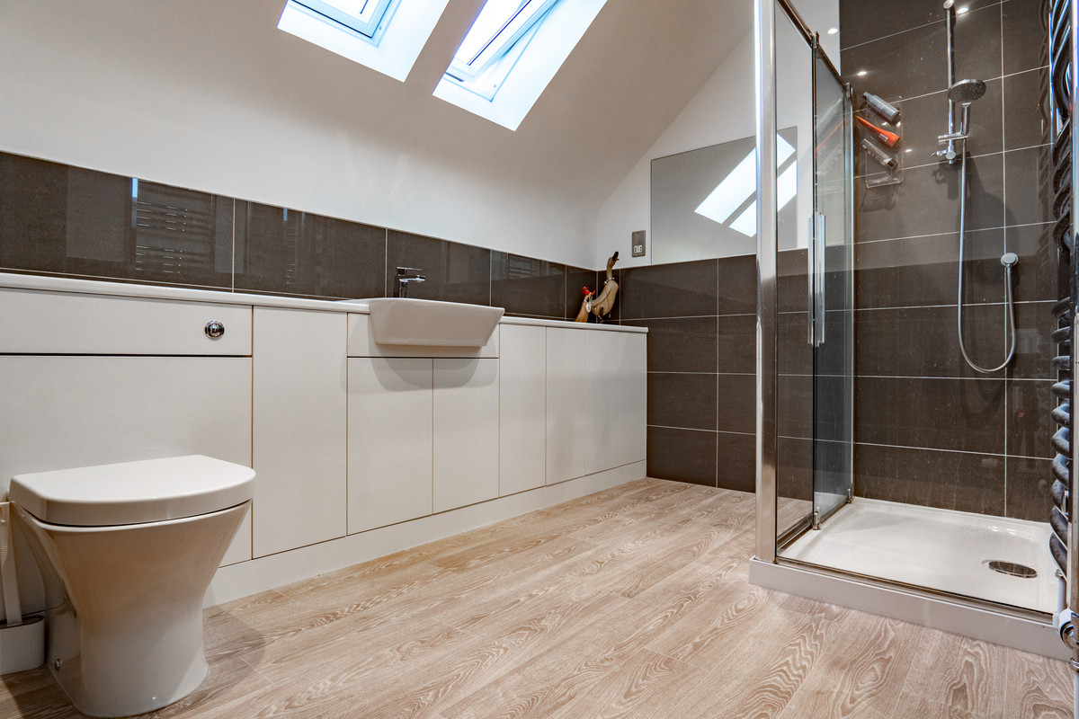 The master bedroom continues the home’s modern style with light decor and soft grey carpet underfoot. Built-in wardrobes with wood effect doors and a central mirrored panel provide generous storage while adding a sleek visual feature. The room also enjoys a private en-suite shower room. The en-suite is finished in glossy grey tiling and white fittings. It includes a corner shower enclosure with chrome mixer shower, a toilet and a wash hand basin set within a large unit. A chrome ladder radiator, rooflight window and gentle sloped ceiling complete this well designed private space.