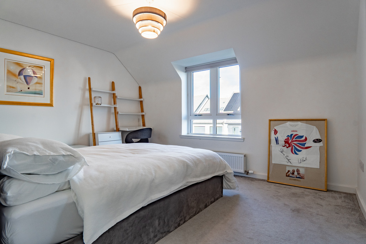 The second bedroom is another bright and spacious double, decorated in the same crisp modern style. The dormer window draws in natural light and adds character to the space, while a compact radiator beneath provides warmth. Mirrored sliding wardrobes line one wall, offering excellent storage and reflecting light throughout the room.