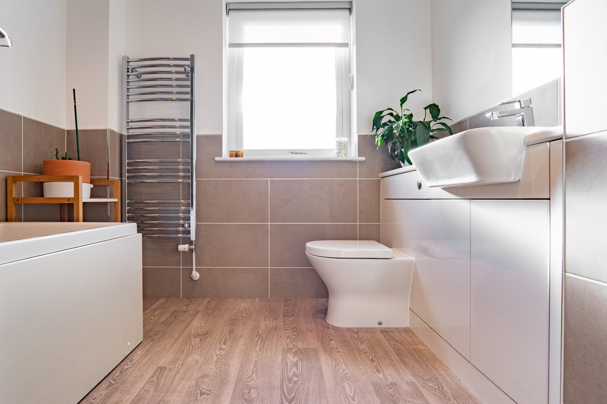 The family bathroom is finished to a high standard with neutral beige tiles complemented by decorative vertical mosaic detailing for a touch of contrast. A modern white suite includes a fitted vanity unit incorporating the wash basin and toilet, offering practical storage and a clean, streamlined look. The bath features a mains shower above with glass screen to the side while a tall chrome ladder radiator completes the room.