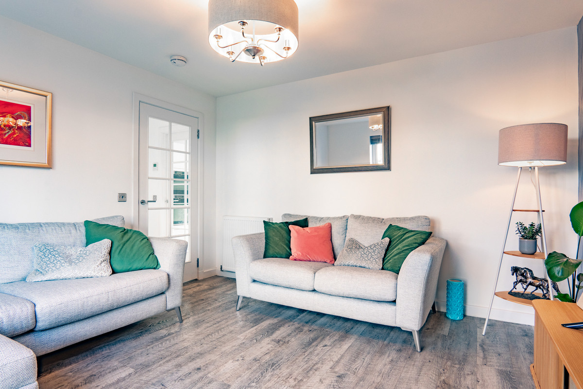 The lounge sits to the front of the house and feels instantly welcoming. A large window fills the room with light, while the white walls and soft grey patterned feature wall create a modern backdrop. The wood effect flooring adds texture, complementing the home’s contemporary feel. It’s a generous space that comfortably accommodates sofas, occasional furniture and media units, making it ideal for everyday relaxation or family gatherings.